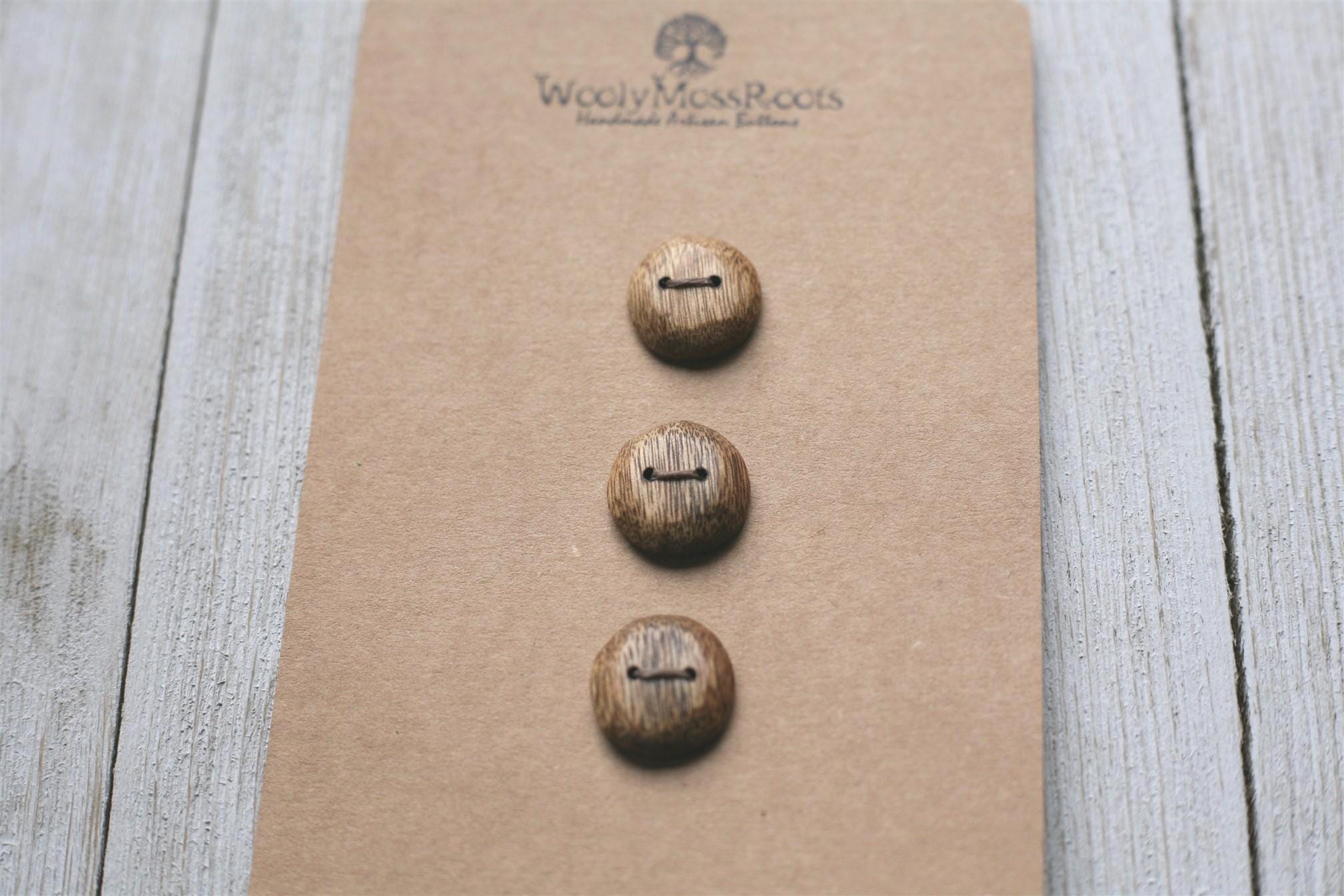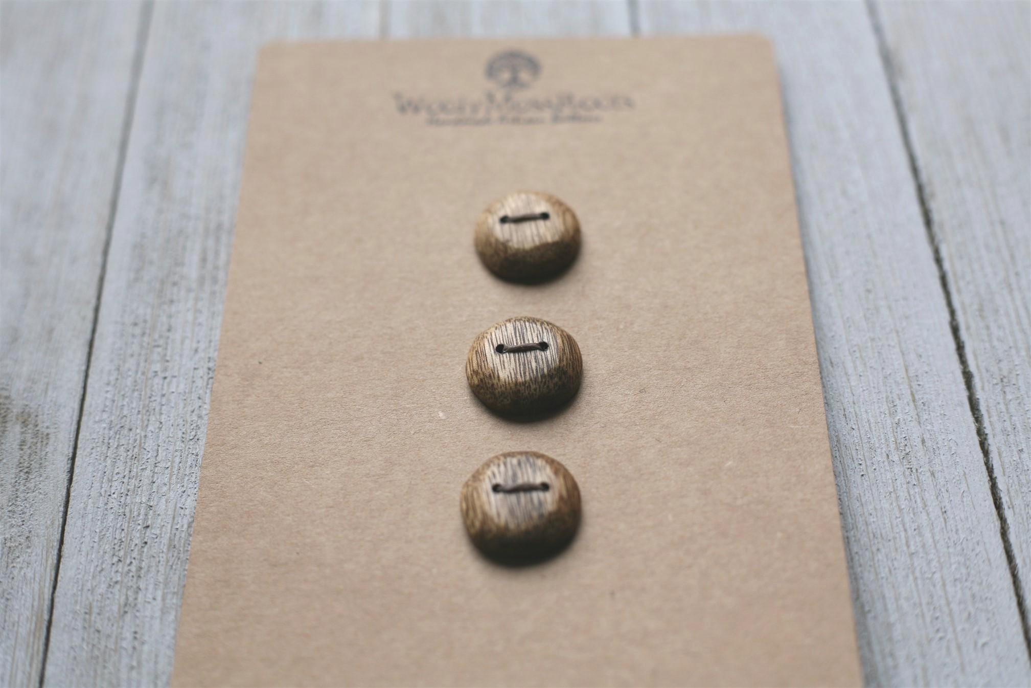 Care for these buttons similarly to washing wool: hand wash garment in cool water and lay flat to dry. The less time wood buttons spend in water, the better. Water can dry out the wood. Soaps and detergents even more so by removing the natural oil finish that protects the wood.