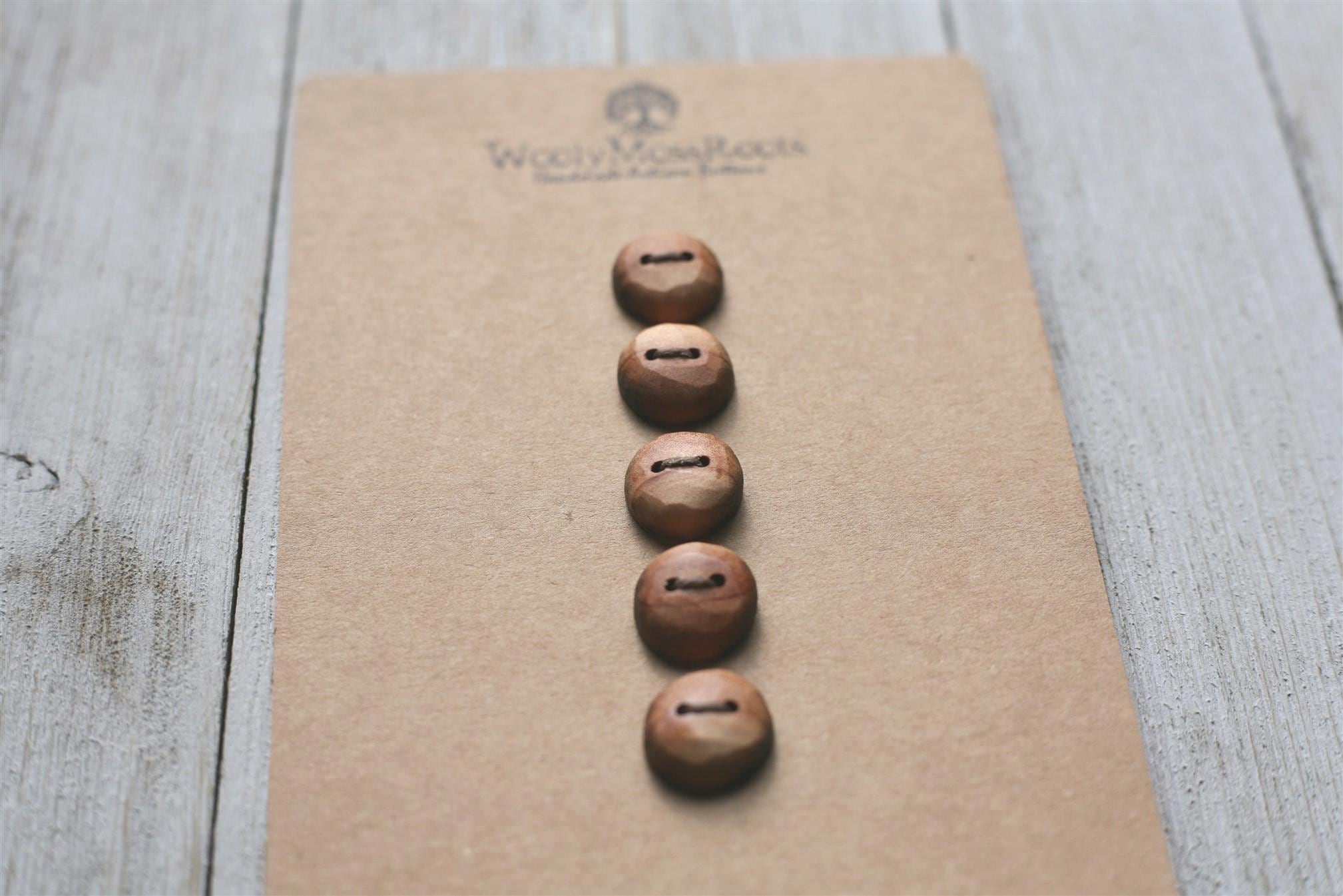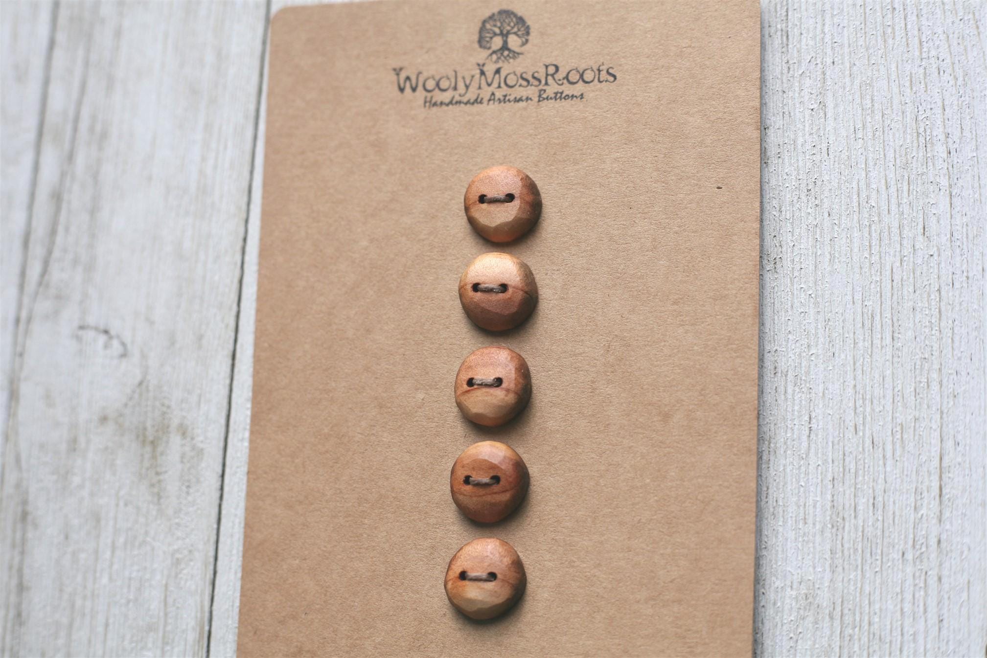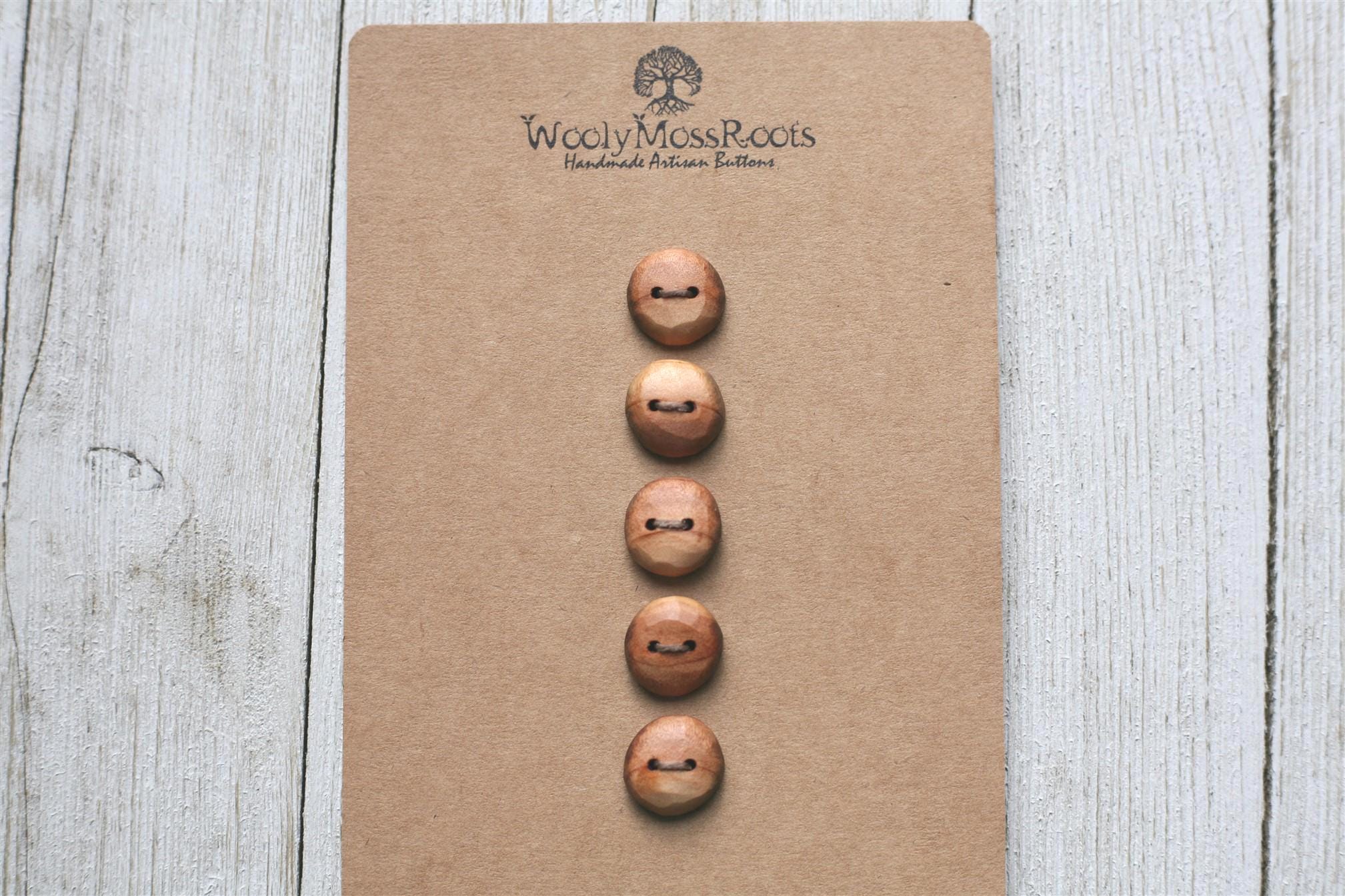 These wooden buttons were created by my husband Jeff in red cedar wood. Red cedar is so beautiful with it's rosy hue. This batch has some rosy hue, some lighter hue, and some stripes.