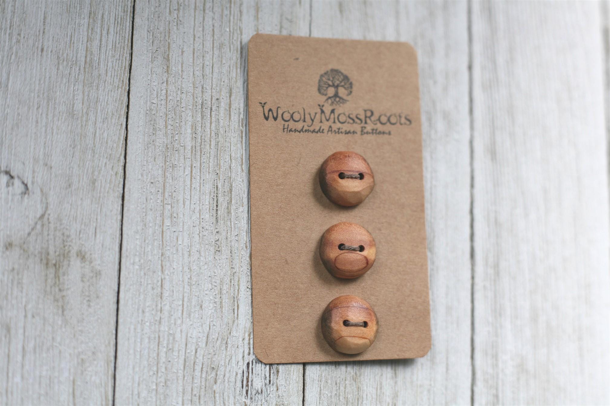 These wooden buttons were created by my husband Jeff in red cedar wood. Red cedar is so beautiful with it's rosy hue. This batch has some rosy hue, some lighter hue, and some stripes.