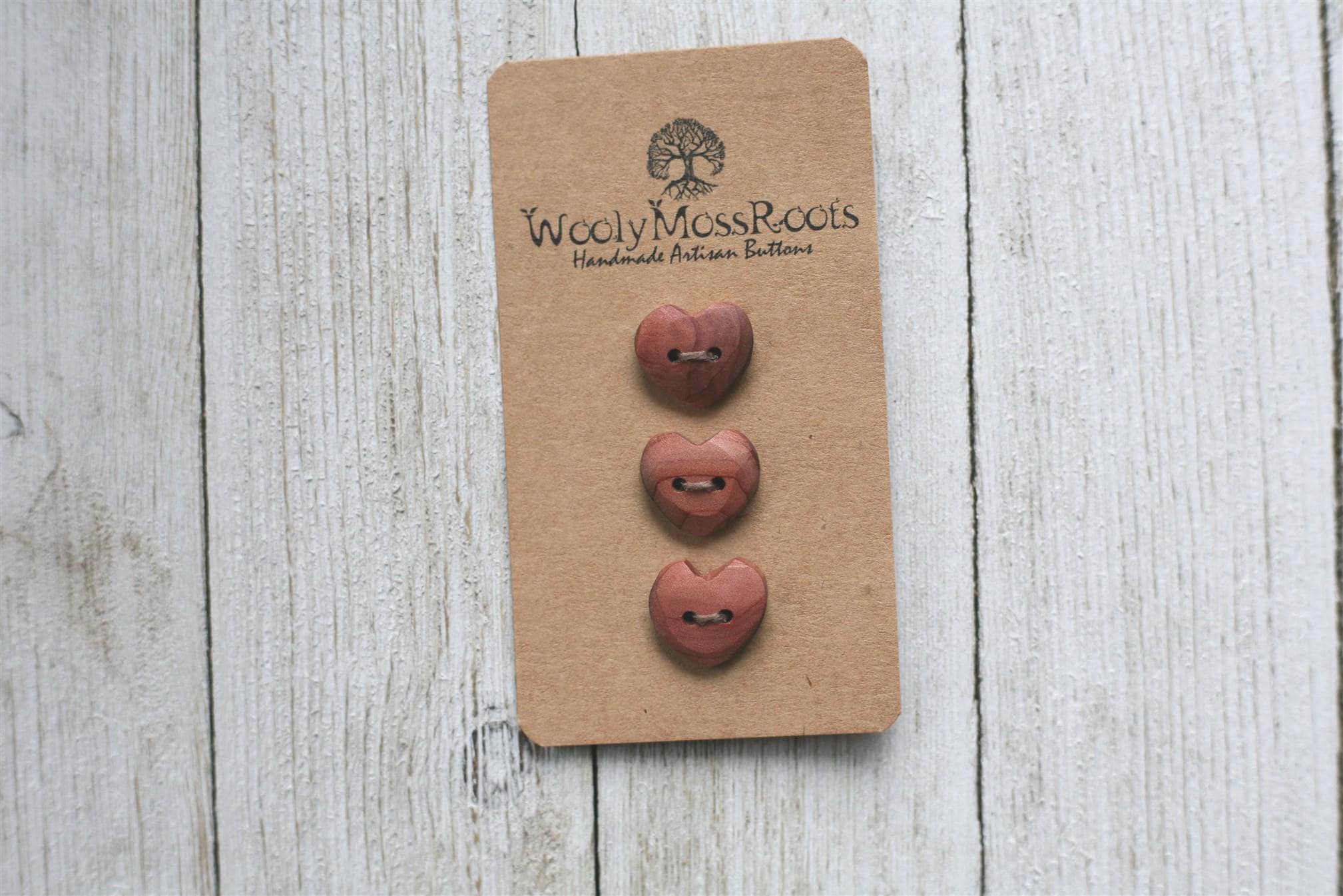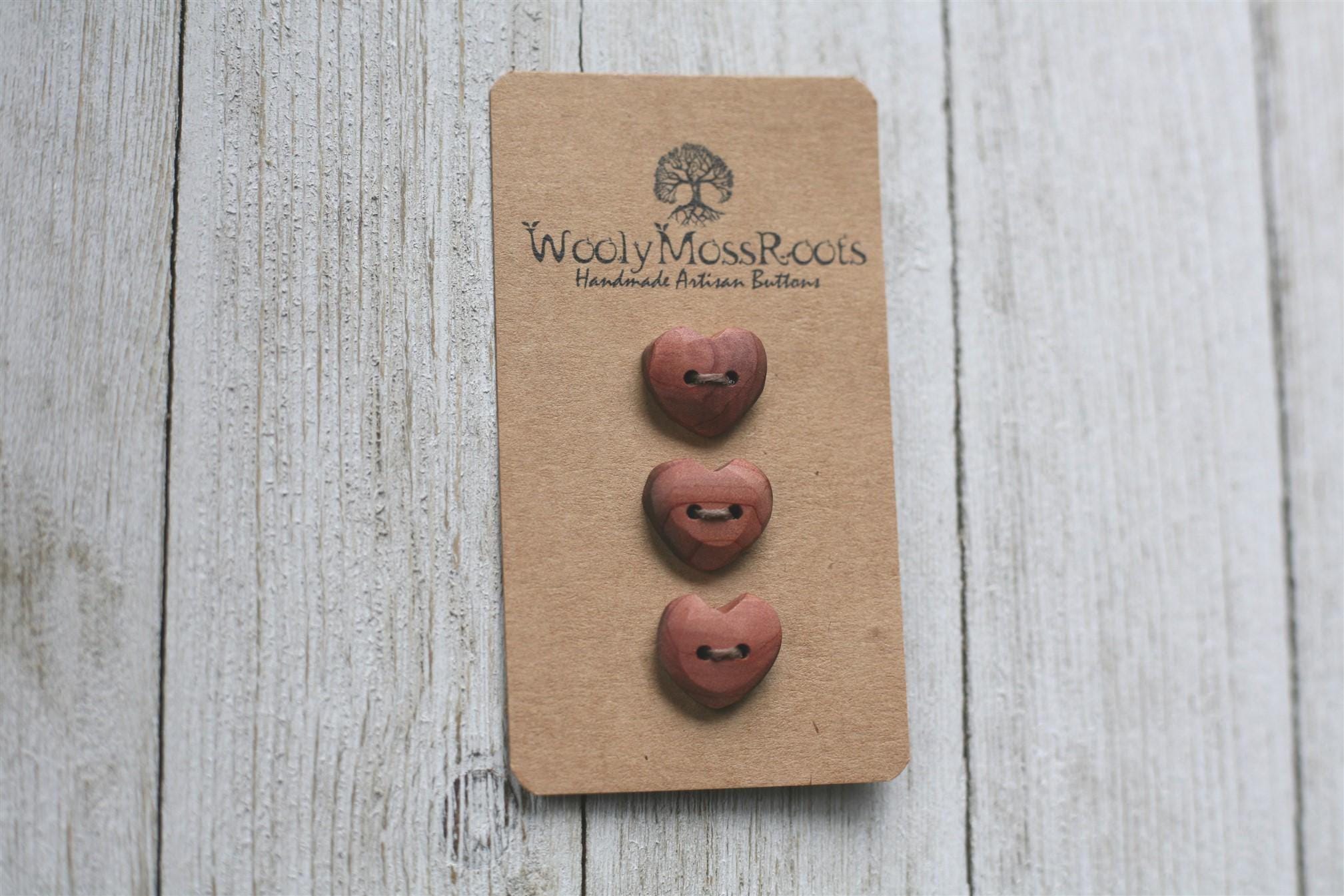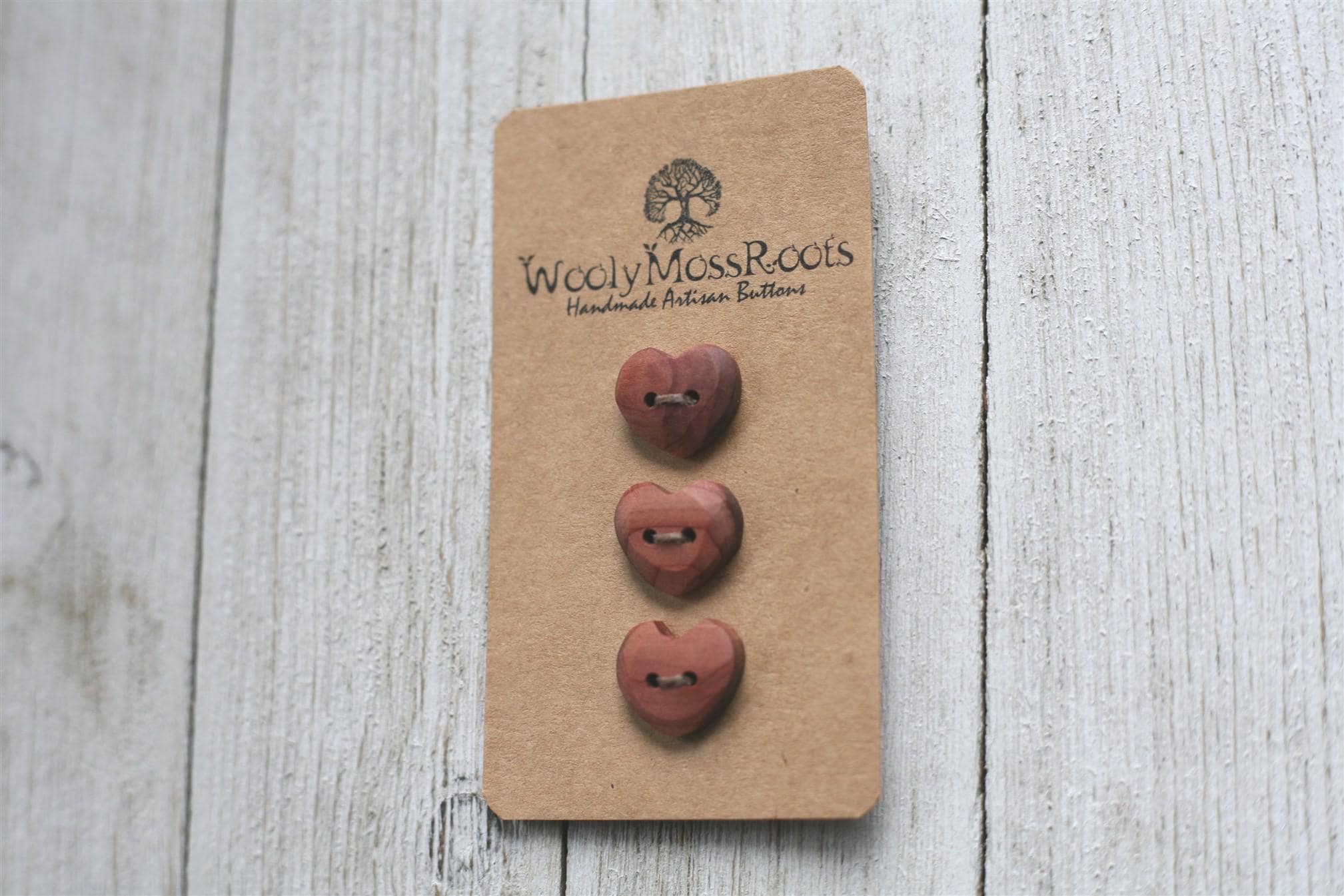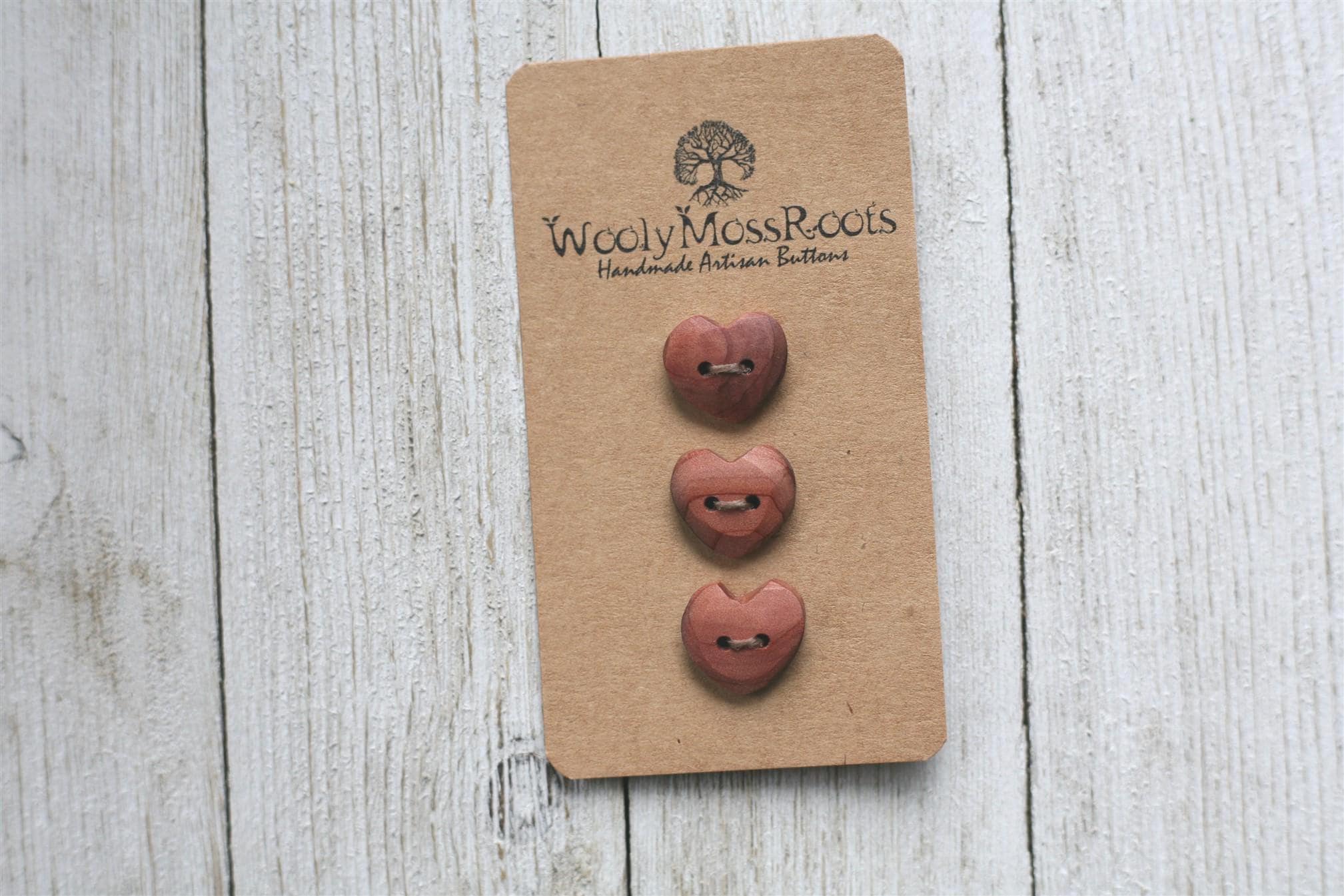 These handmade wooden heart buttons were created by my husband Jeff in red cedar wood. Red cedar is so beautiful with it's rosy hue.