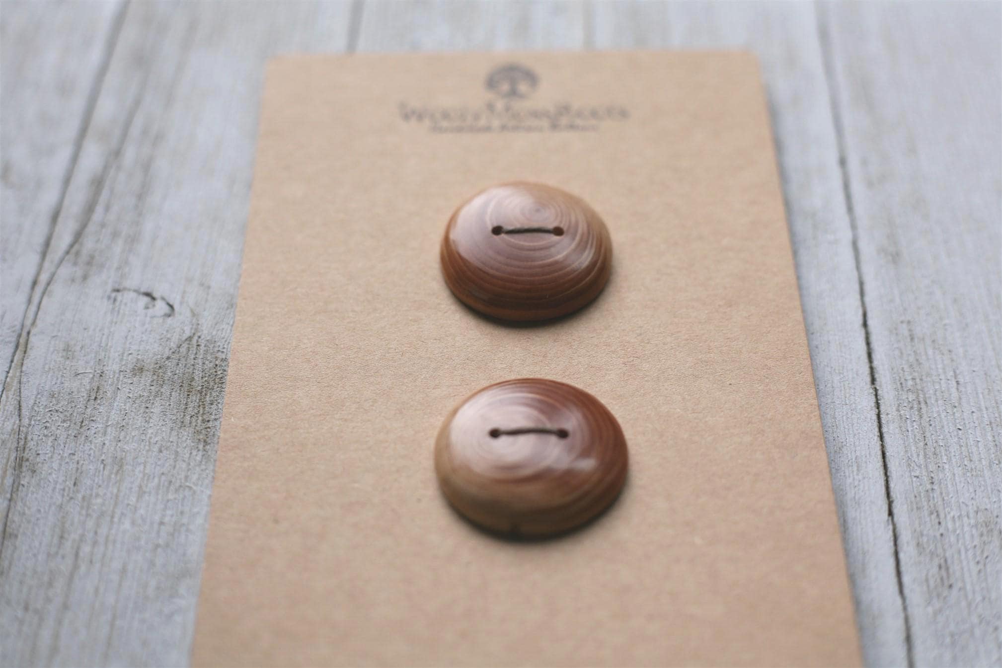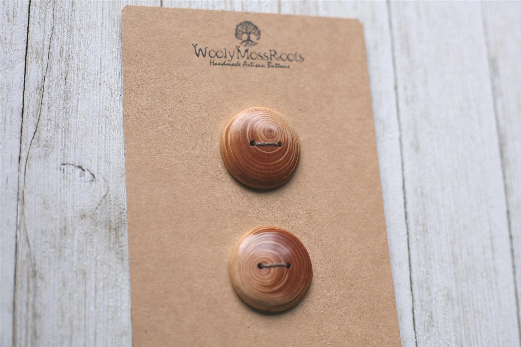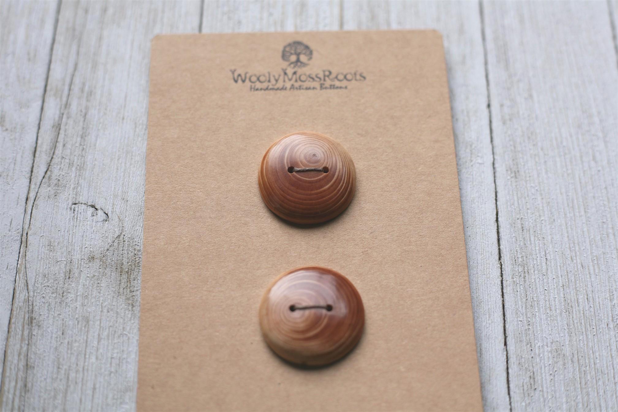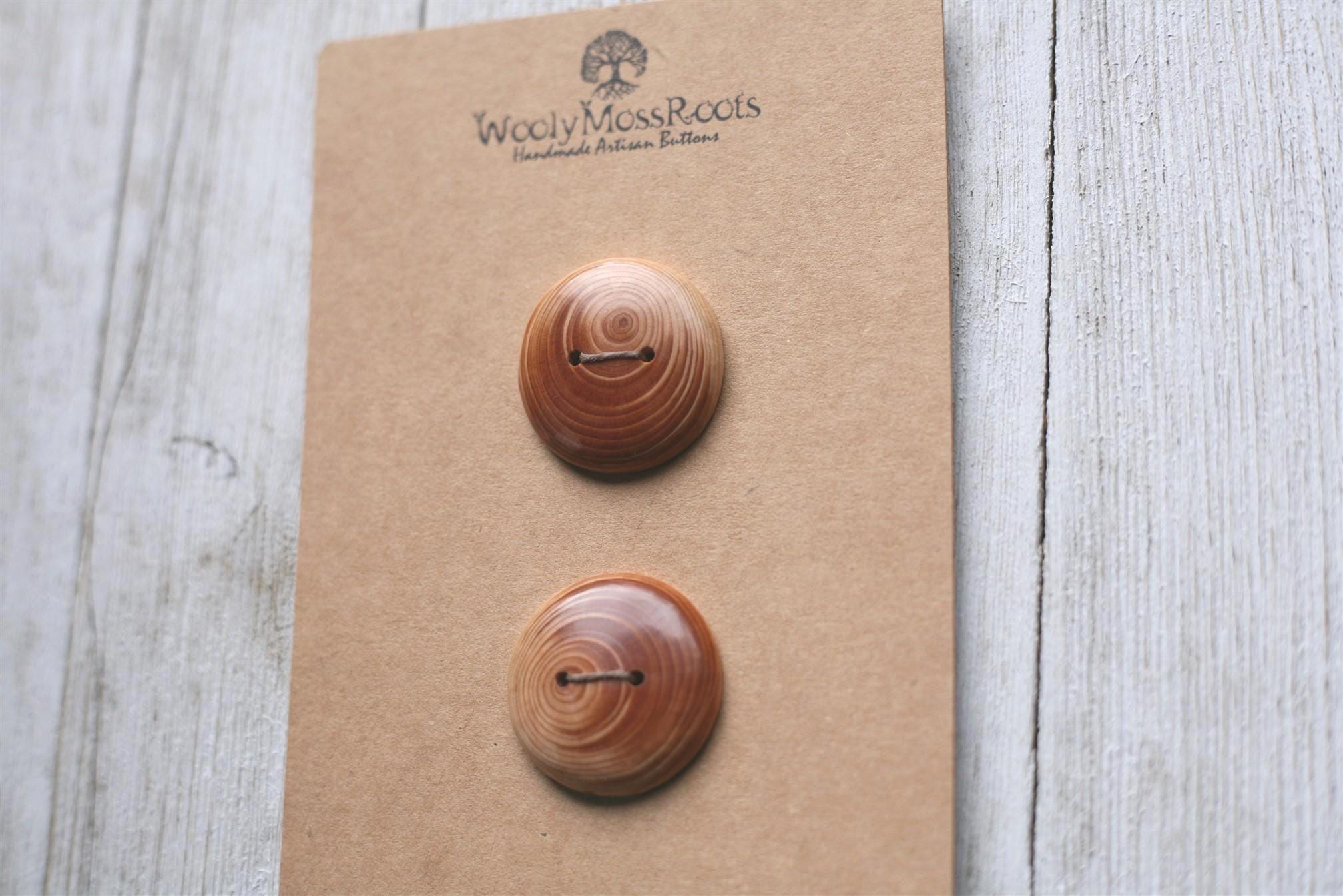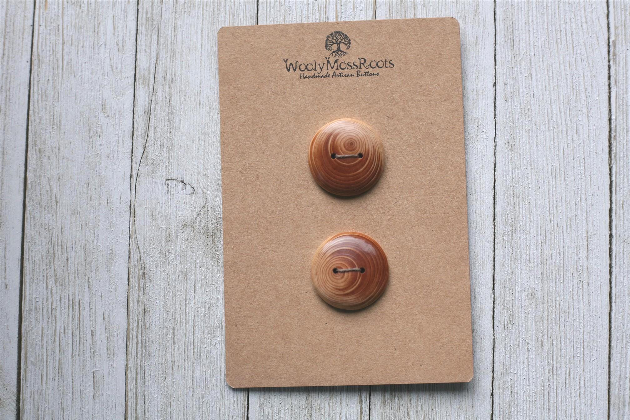 These handmade wooden buttons were created by my husband Jeff in Oregon hemlock wood. We love hemlock wood with it's warm honey hue! The contrast of colors and the rings of growth are just stunning in these buttons!