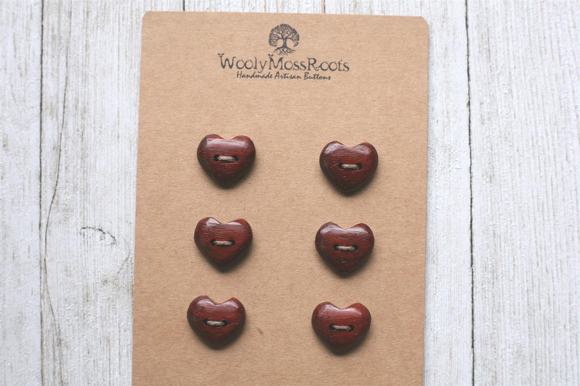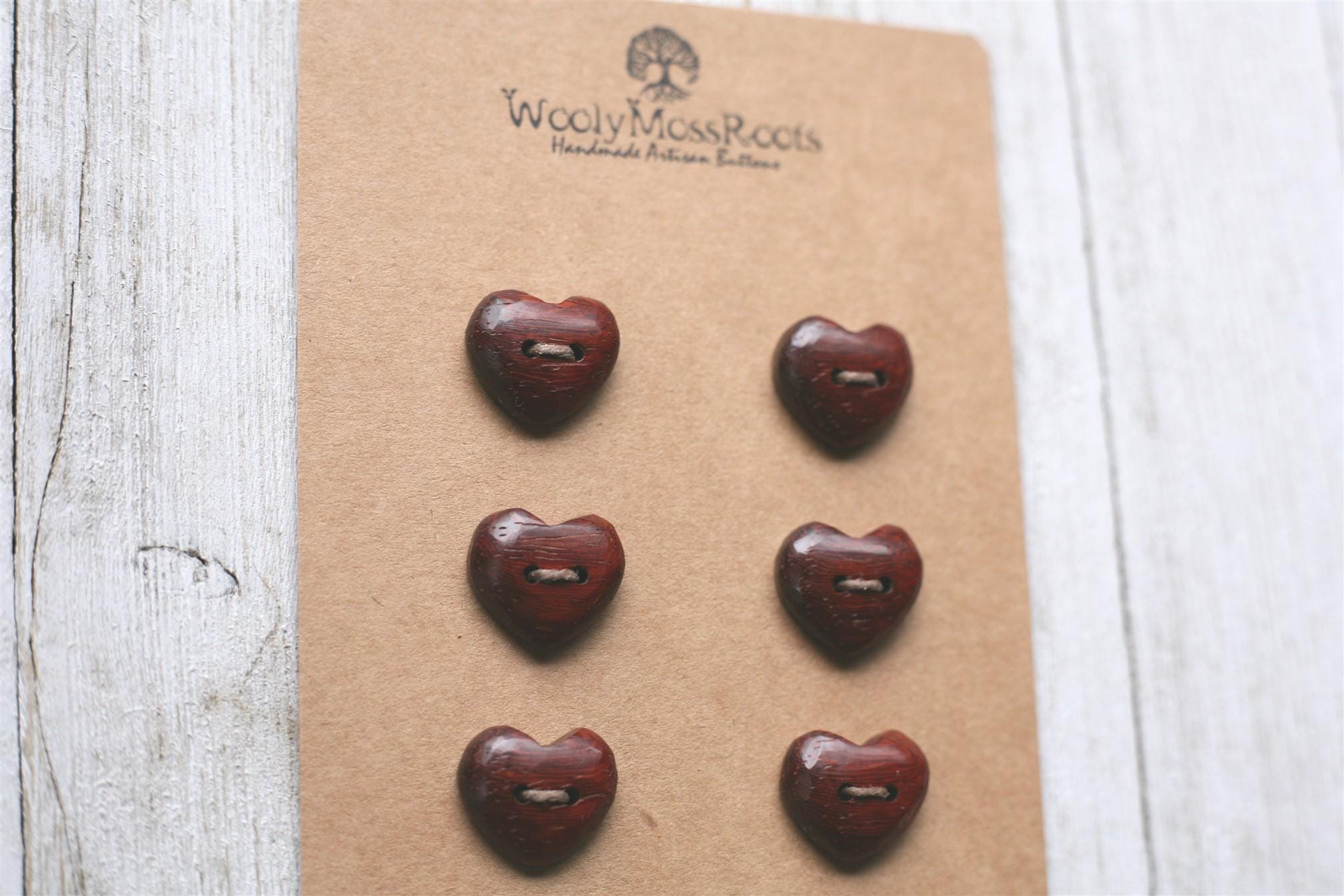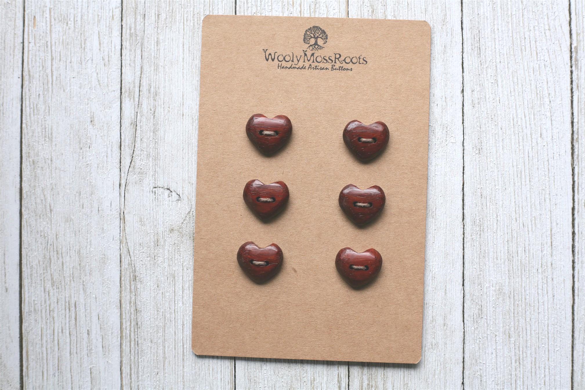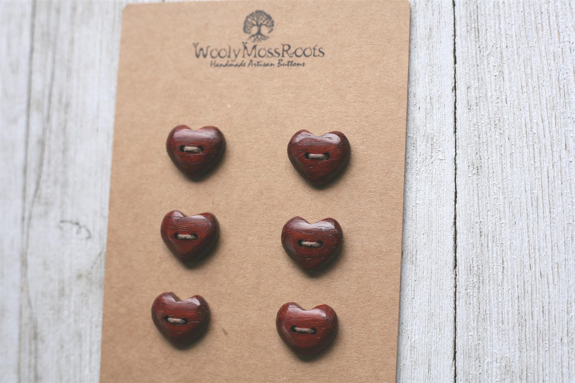 These handmade wooden heart buttons were created by my husband Jeff in vermillion, with a red hue that is incredible.
