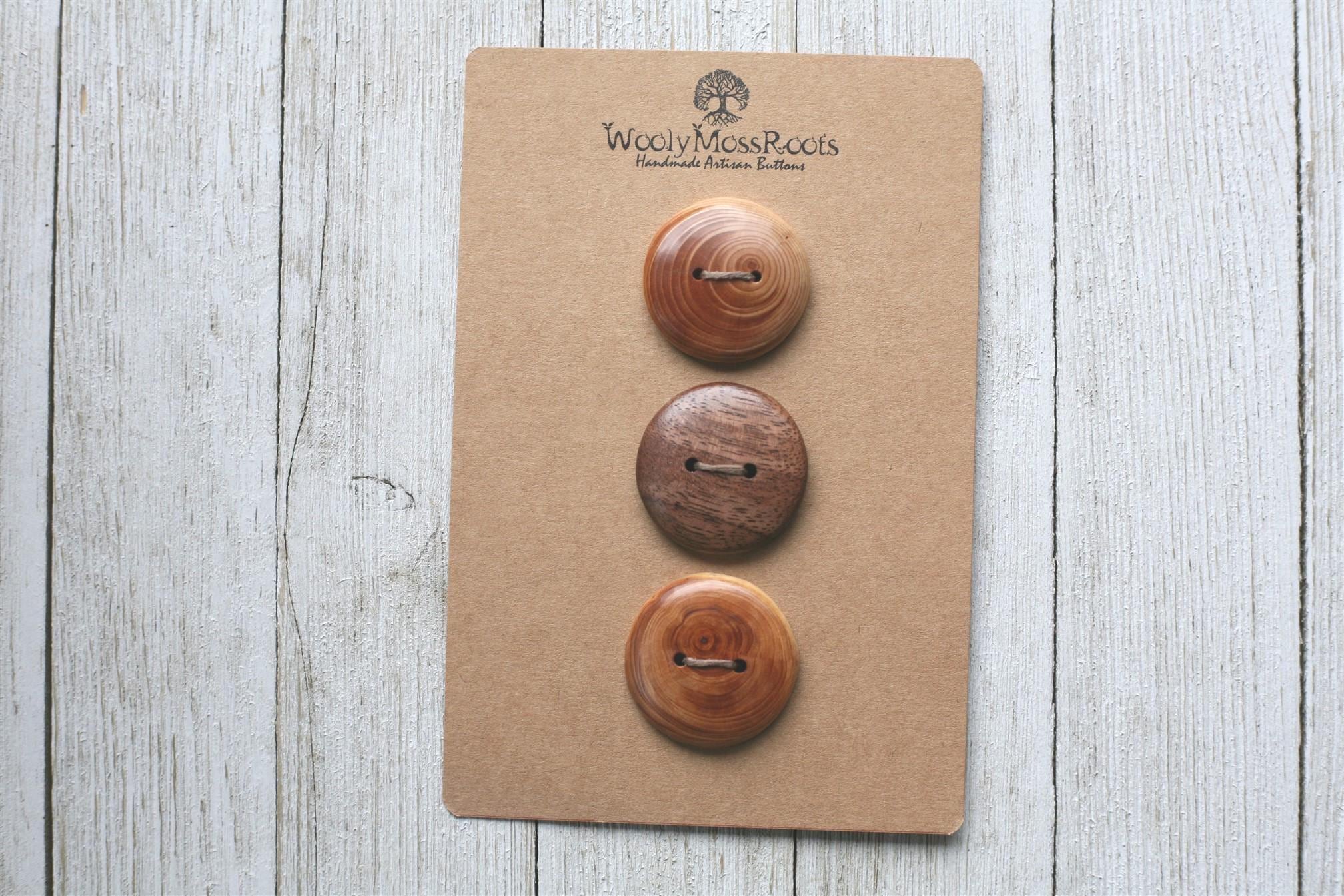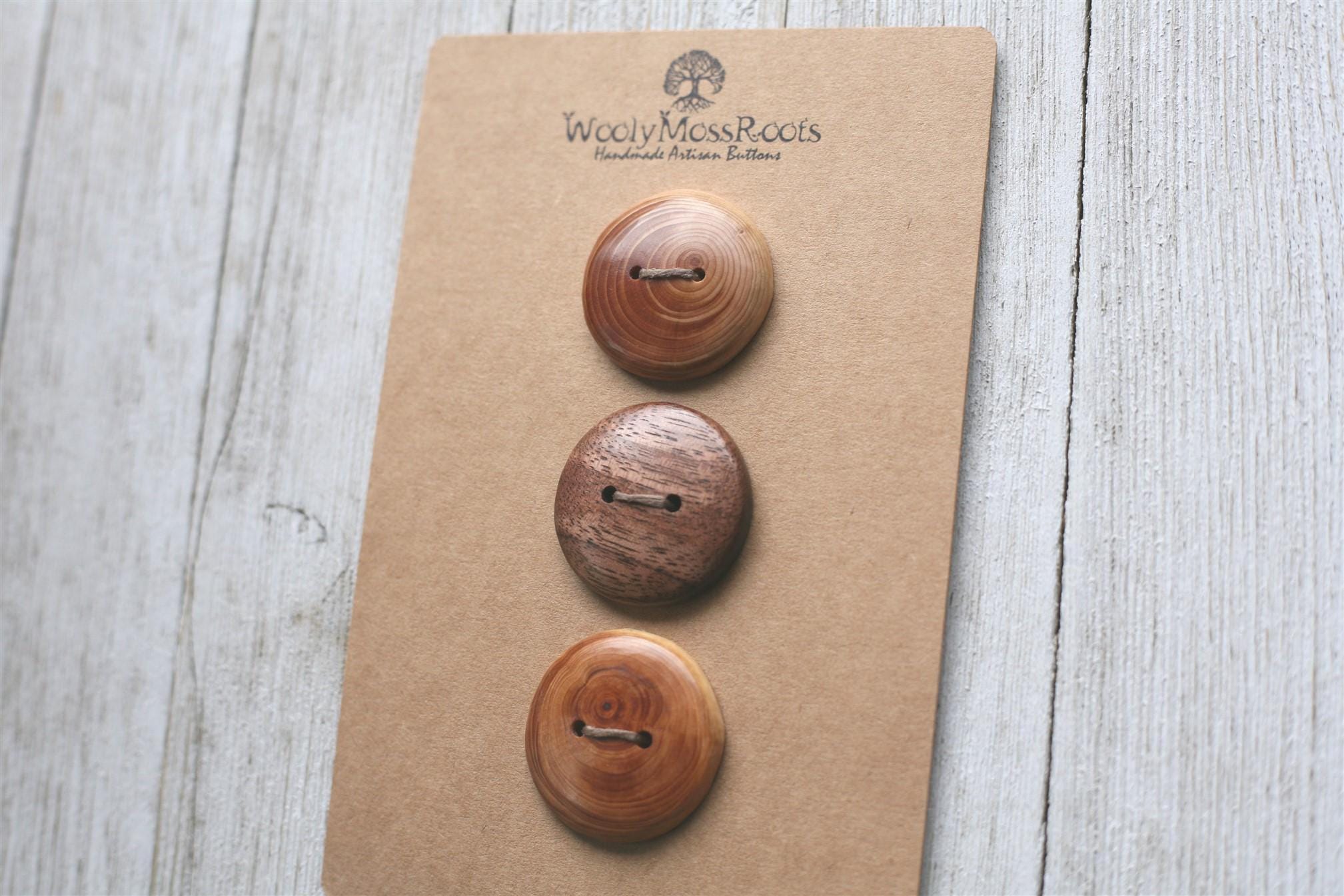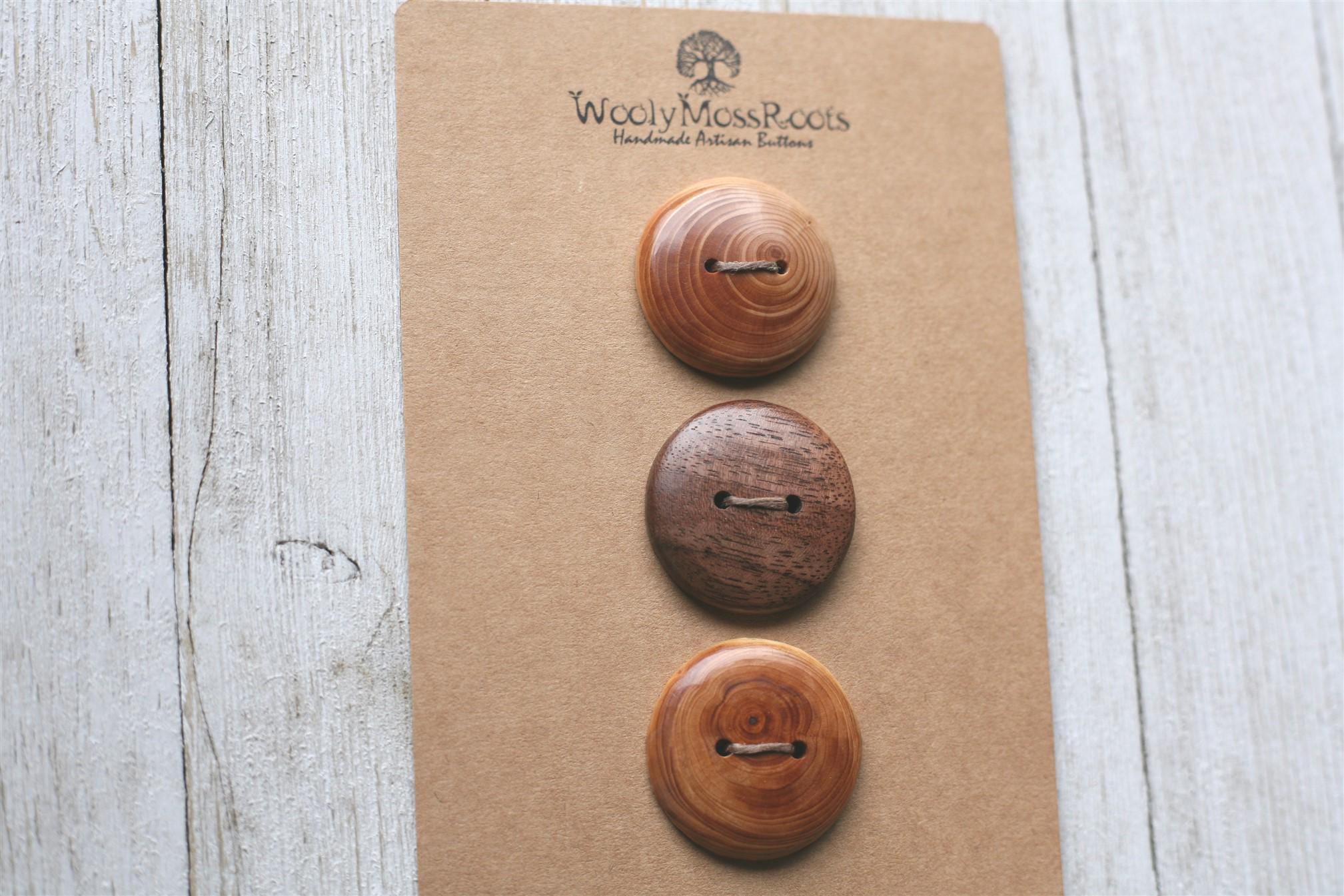 These wooden buttons were created by my husband Jeff in Oregon hemlock wood, black walnut wood, and Oregon yew wood. All three woods are so gorgeous, and they go together to make such a beautiful set of buttons.
