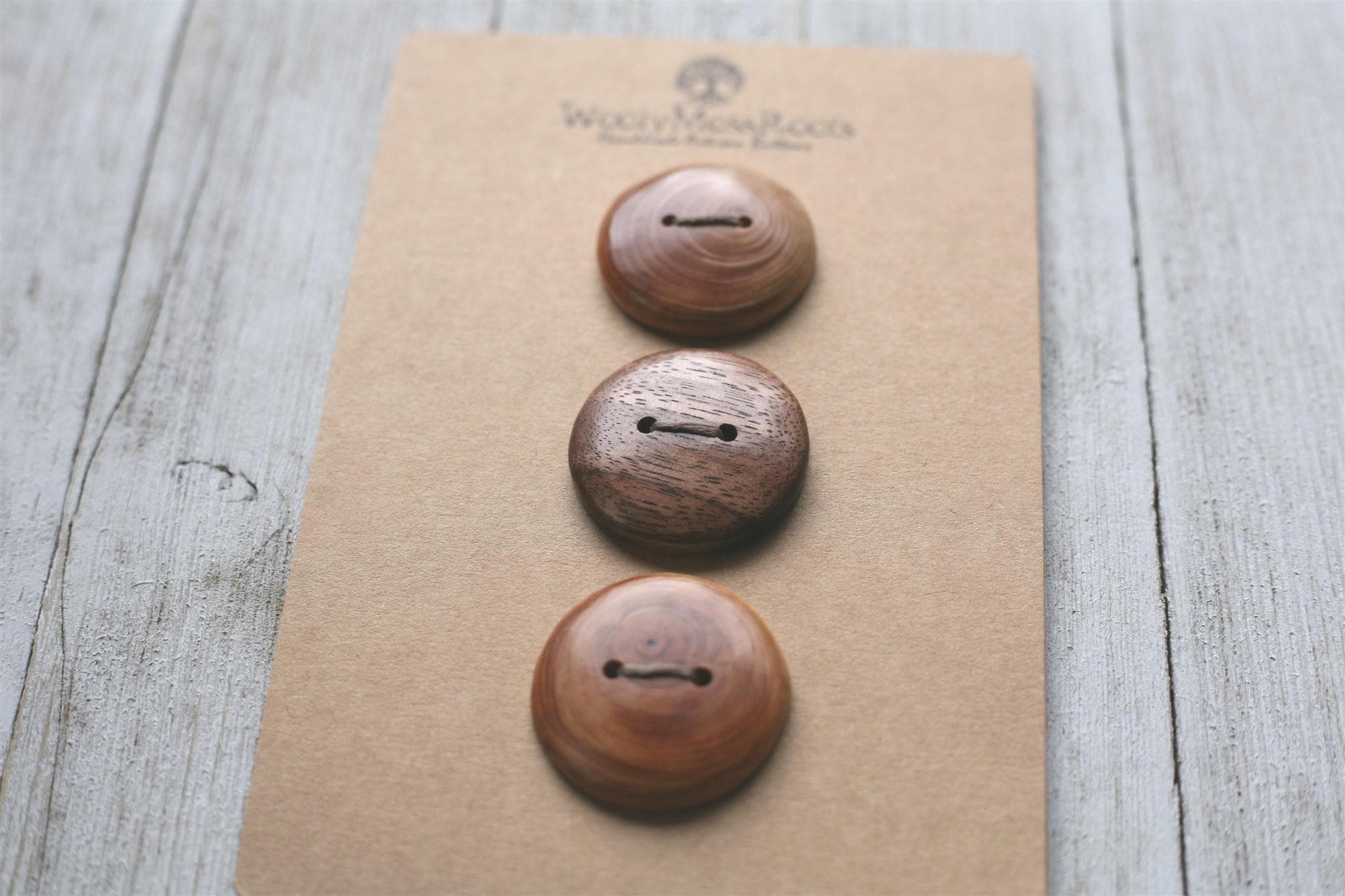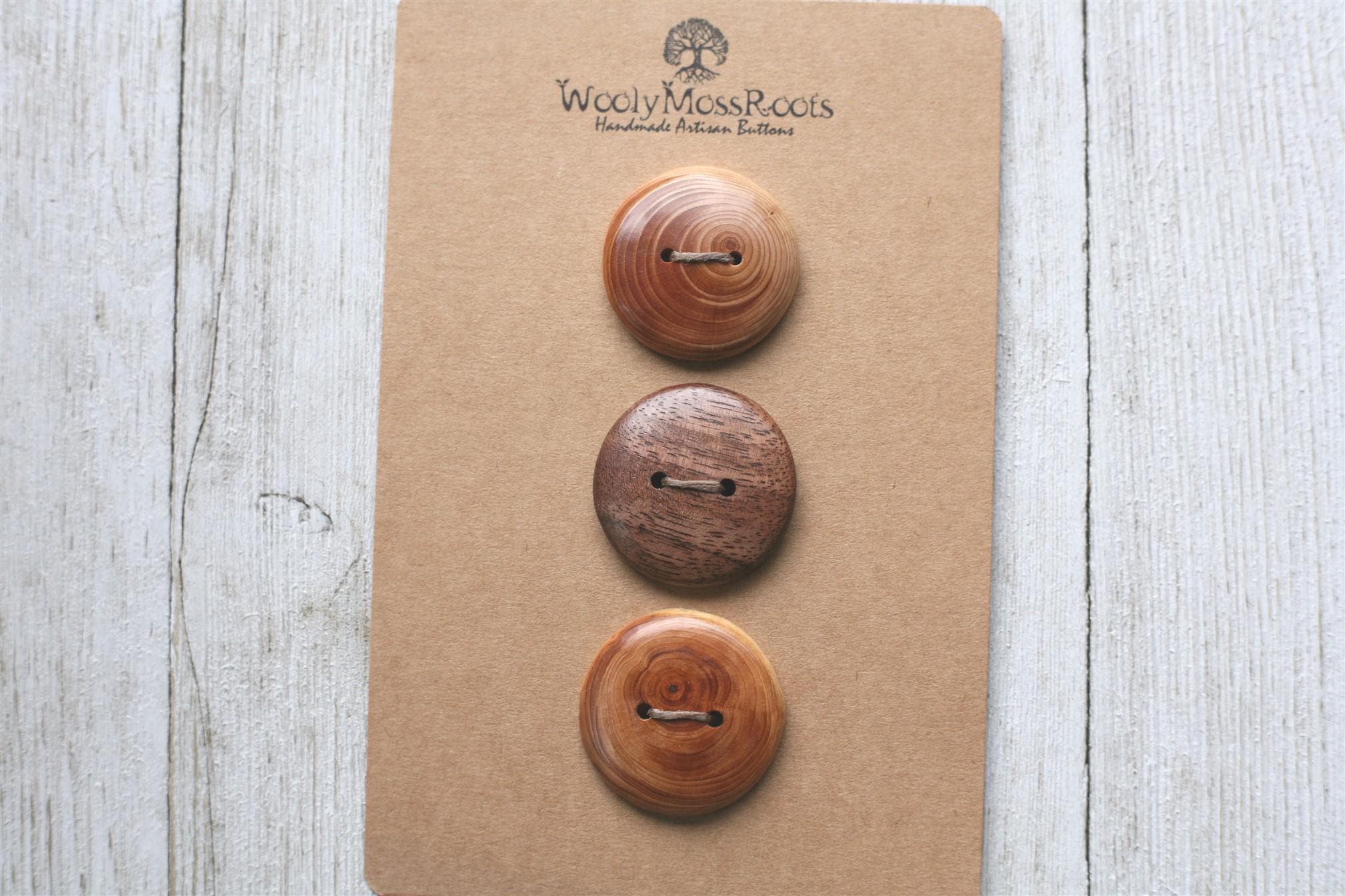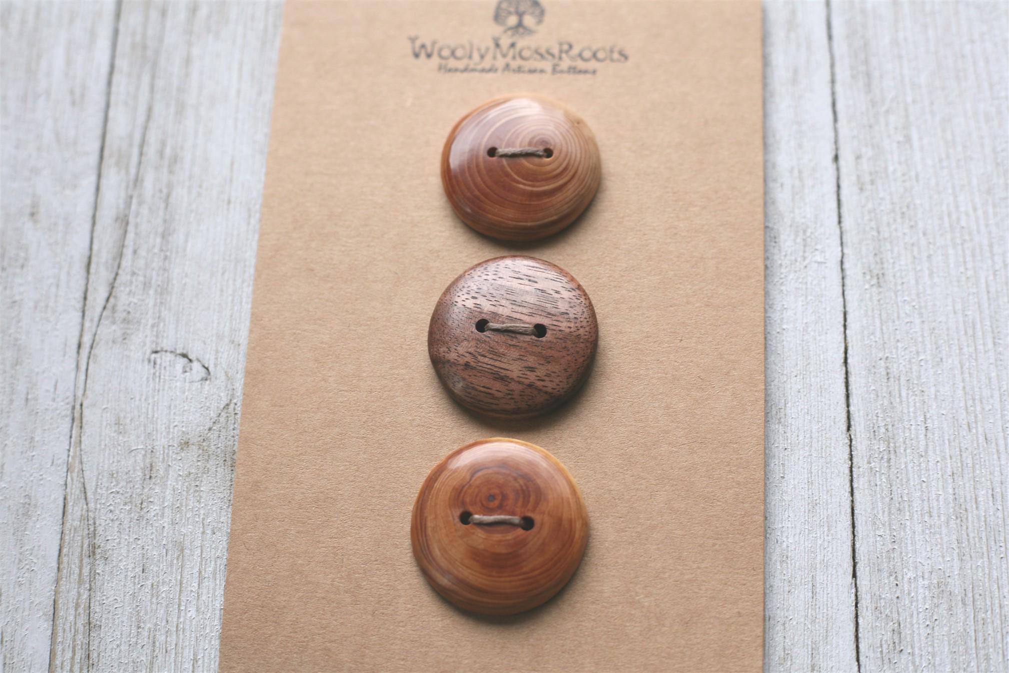 These wooden buttons were created by my husband Jeff in Oregon hemlock wood, black walnut wood, and Oregon yew wood. All three woods are so gorgeous, and they go together to make such a beautiful set of buttons.