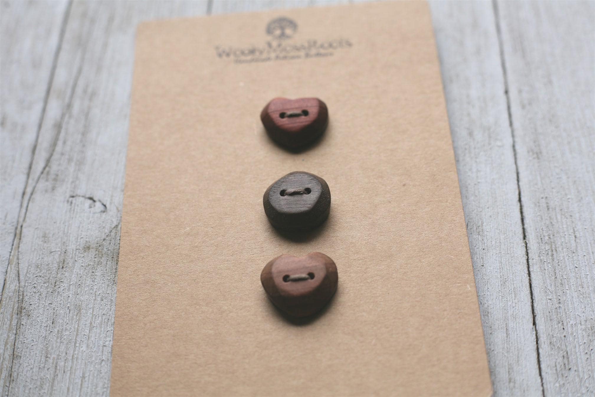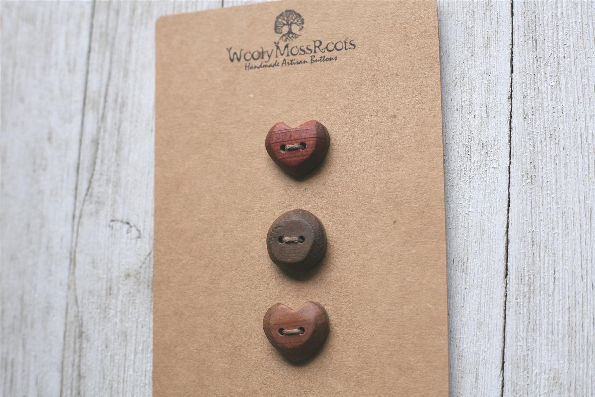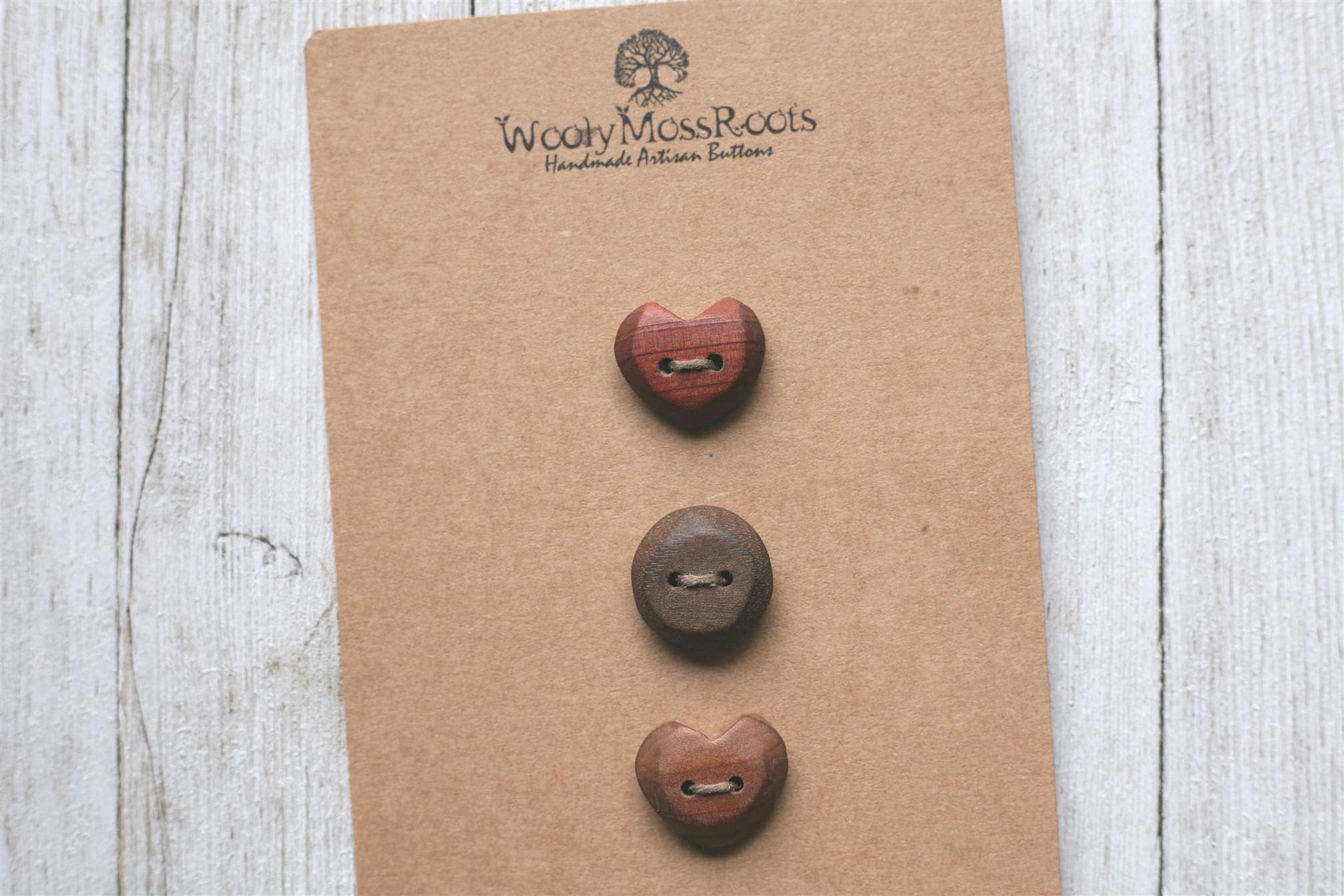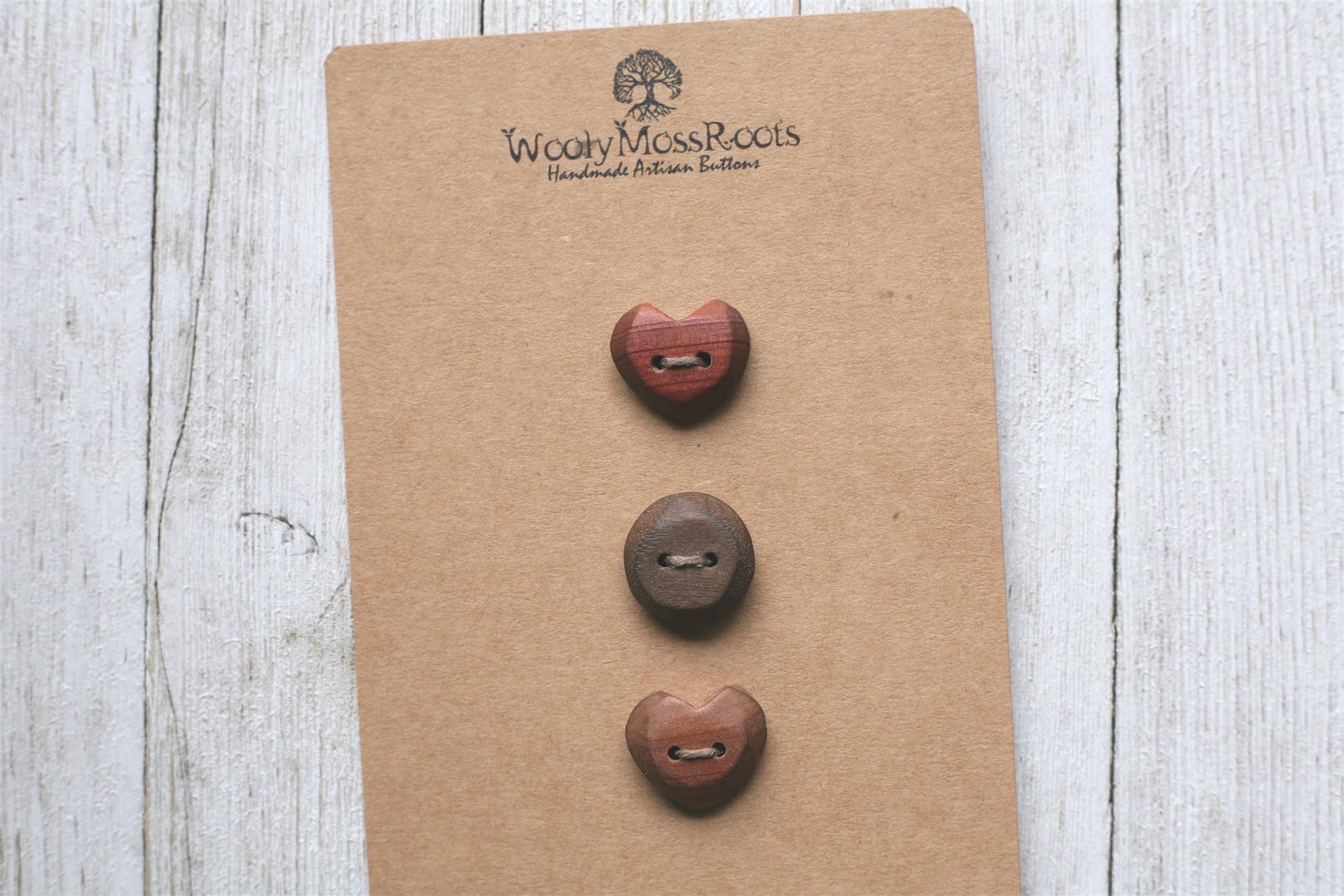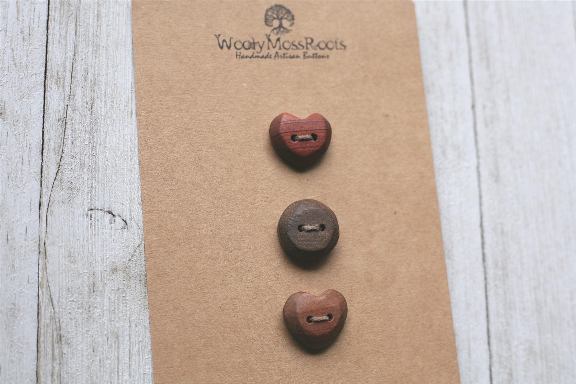 These wooden buttons were created by my husband Jeff in black walnut and red cedar wood. These buttons go together to make a fun mix! I love the carved red cedar hearts and the deep hue of the black walnut wood.