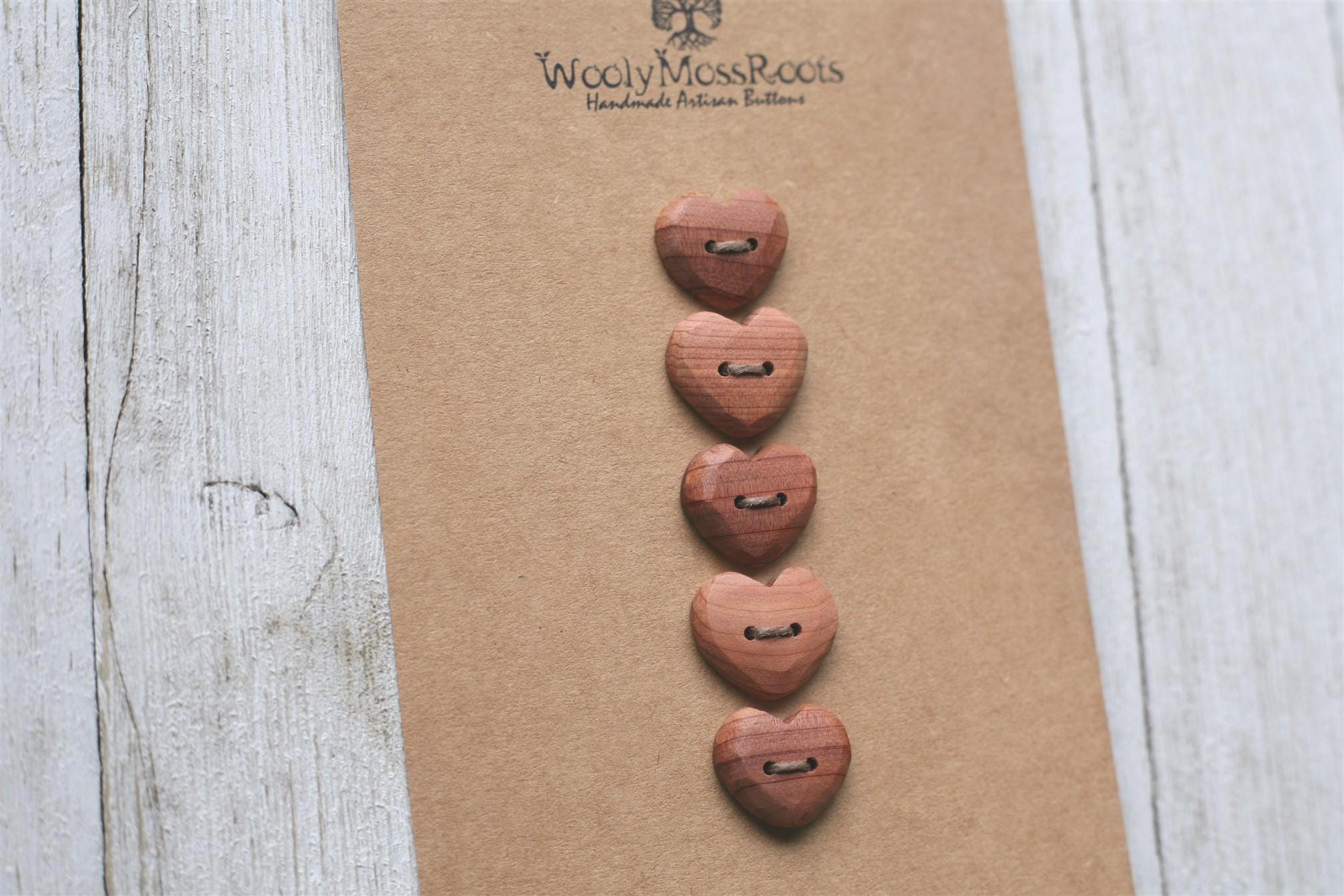 These handmade wooden heart buttons were created by my husband Jeff in red cedar wood. Red cedar is so beautiful with it's rosy hue.