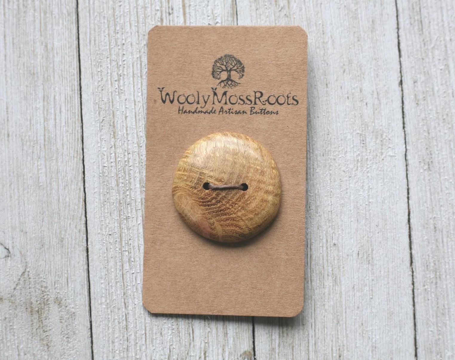 This handmade wooden button was created by my husband Jeff in osage orange wood. This wood is naturally this beautiful yellow color! Osage orange wood is often used for natural dyeing.