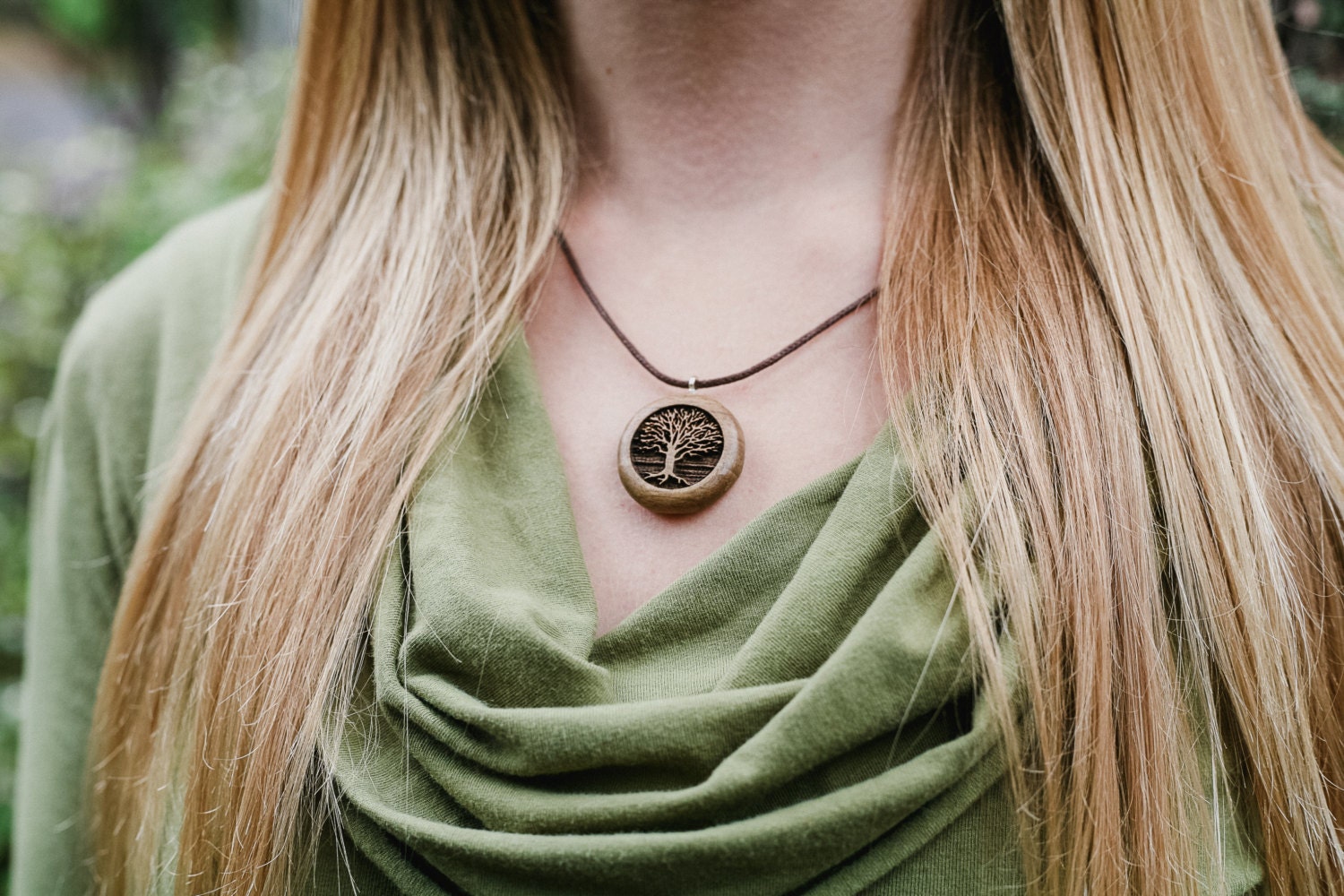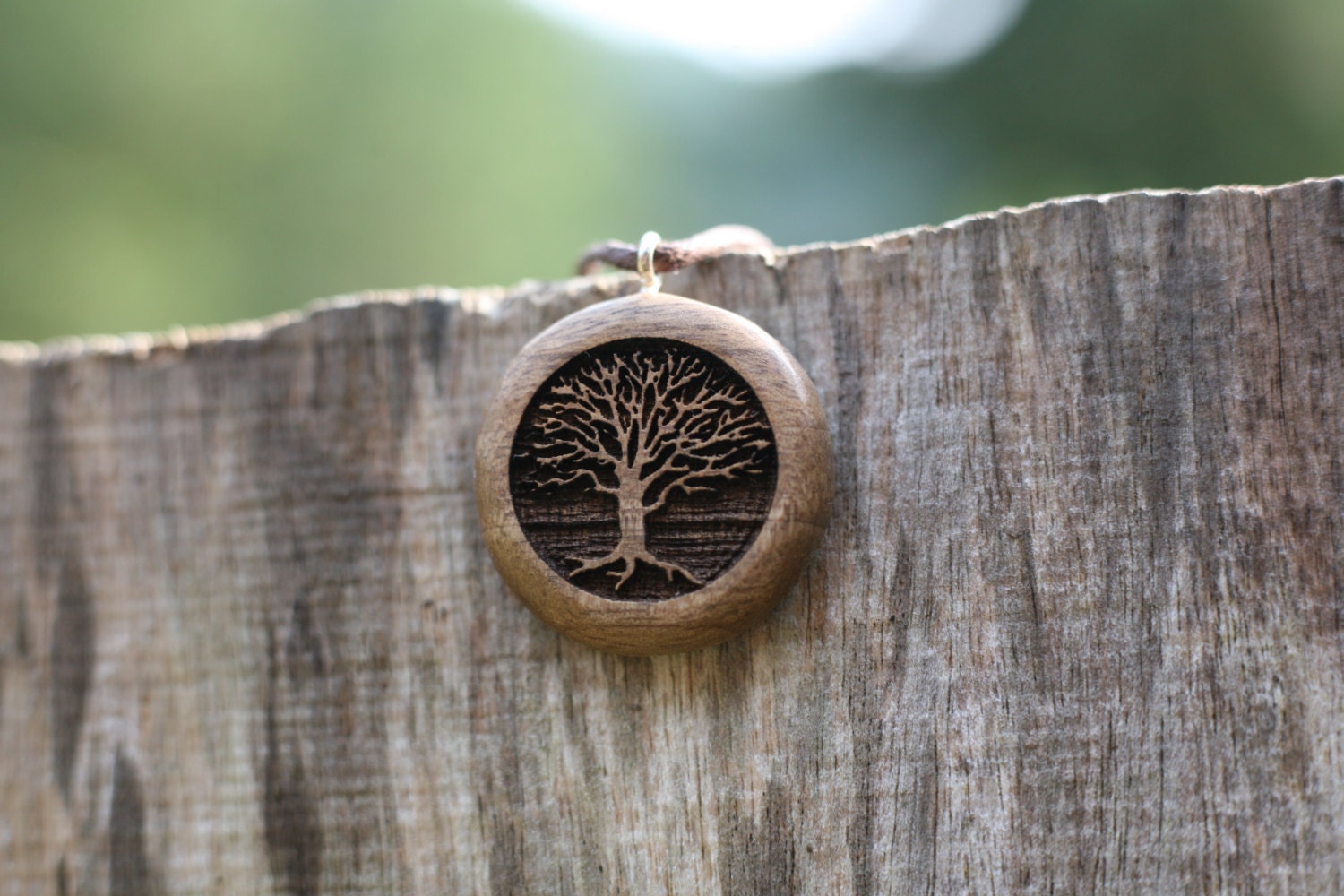 This wooden tree pendant was created by my husband Jeff in Oregon myrtlewood. Myrtlewood is a special (and beautiful wood) that grows in southern Oregon and northern California, along the coast. According to folklore, it is said to bring prosperity. Jeff sands and polishes the wood until it simply glows, burns the tree design into the wood, then finishes the wood with a natural oil finish. This pendant comes on a dark brown cotton cord with a slide knot so you can adjust the length. (To adjust the length, just pull the knots.)