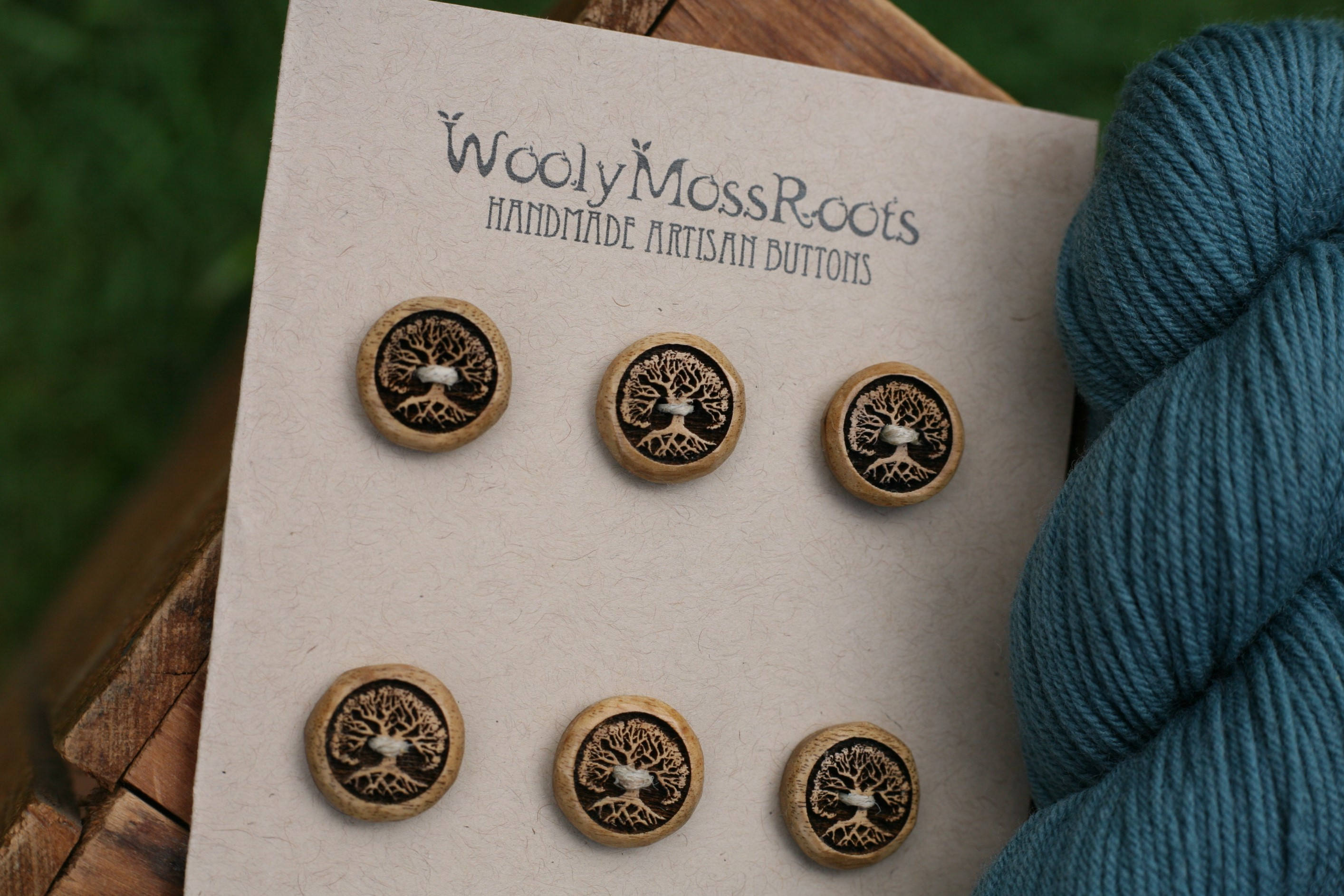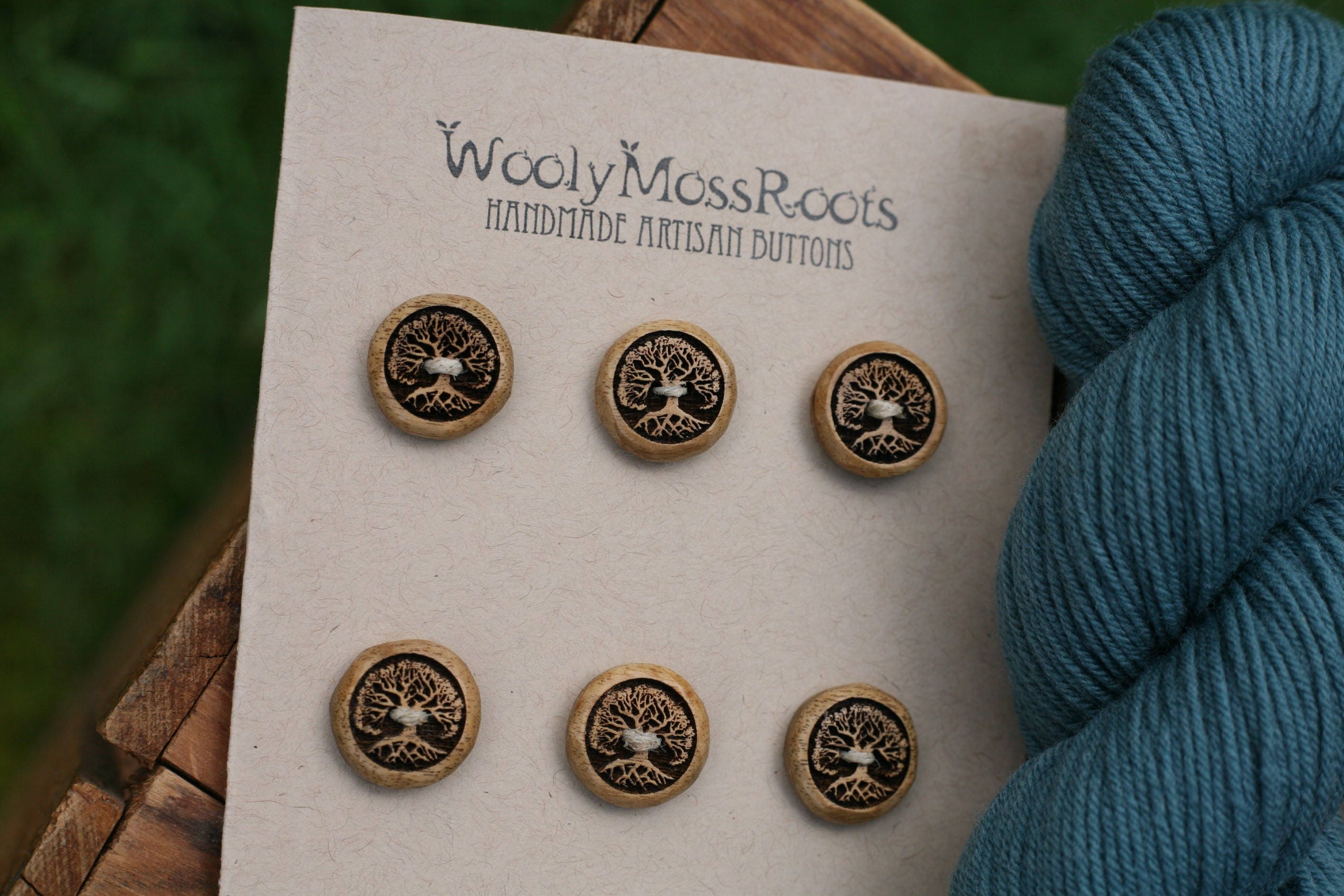 These handmade wooden buttons were created by my husband Jeff in Oregon myrtlewood. Myrtlewood is a special (and beautiful wood) that grows in southern Oregon and northern California, along the coast. According to folklore, it is said to bring prosperity. Jeff created this gorgeous tree design, which I adore. He sanded these buttons and burned his original tree design onto each one. Pictured with blue yarn, these buttons would pair nicely with many different colors.