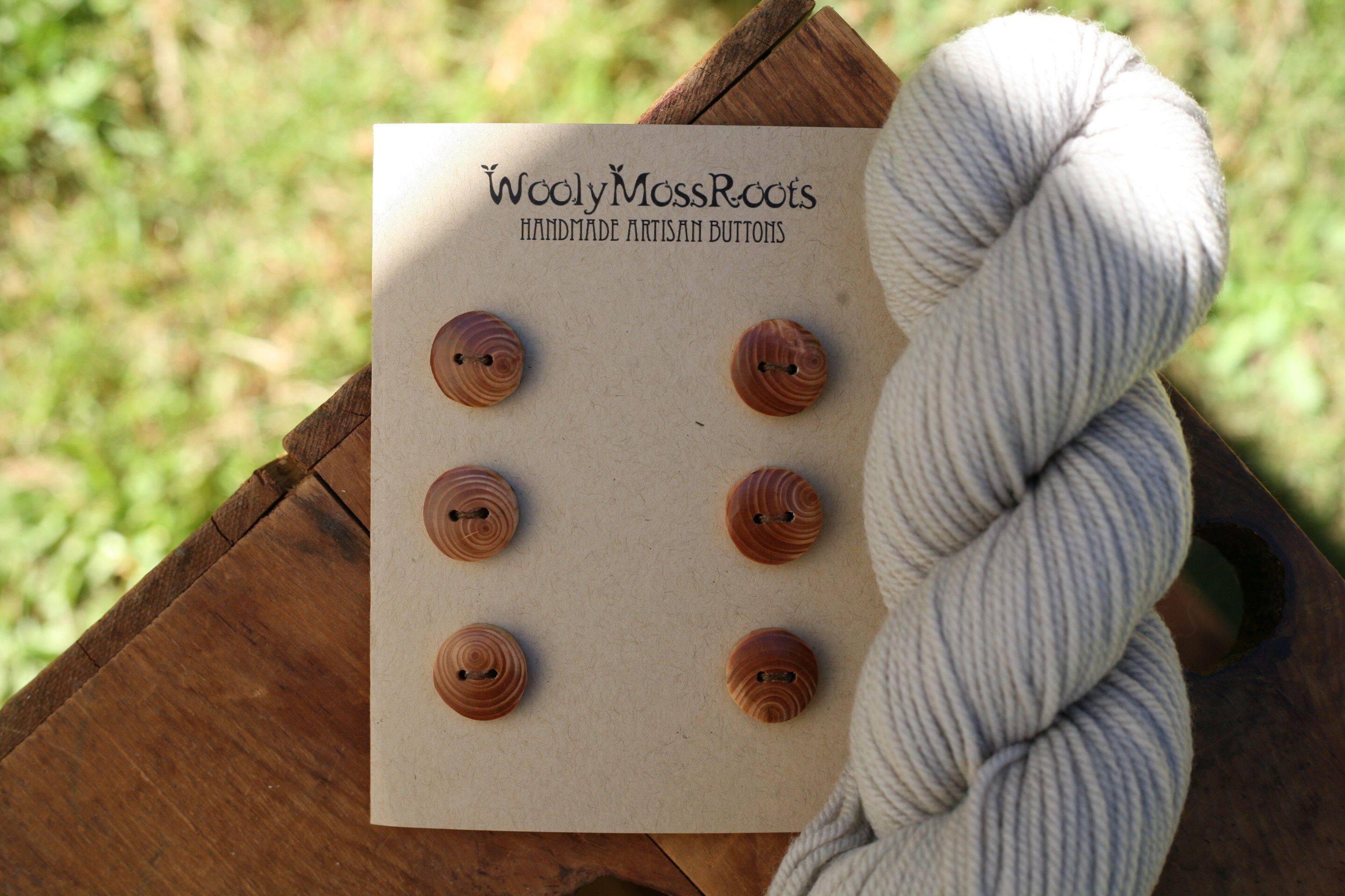 These wooden buttons were created by my husband Jeff in hemlock wood. The hemlock wood came from our yard (we had to get the tree removed because it was leaning towards the house and was too close.) He has been using up every bit of that beautiful wood, and these buttons are one of the results. I love the warm hue of this wood, and all the rings of growth. Sanded so smooth- you'll love the way they feel. All the sanding and polishing also brings out the beauty of the wood, and the magic he puts into them makes these buttons shine like gems. I think these buttons are incredibly beautiful, just radiant. Pictured with grey yarn, these buttons would pair nicely with many different colors.
