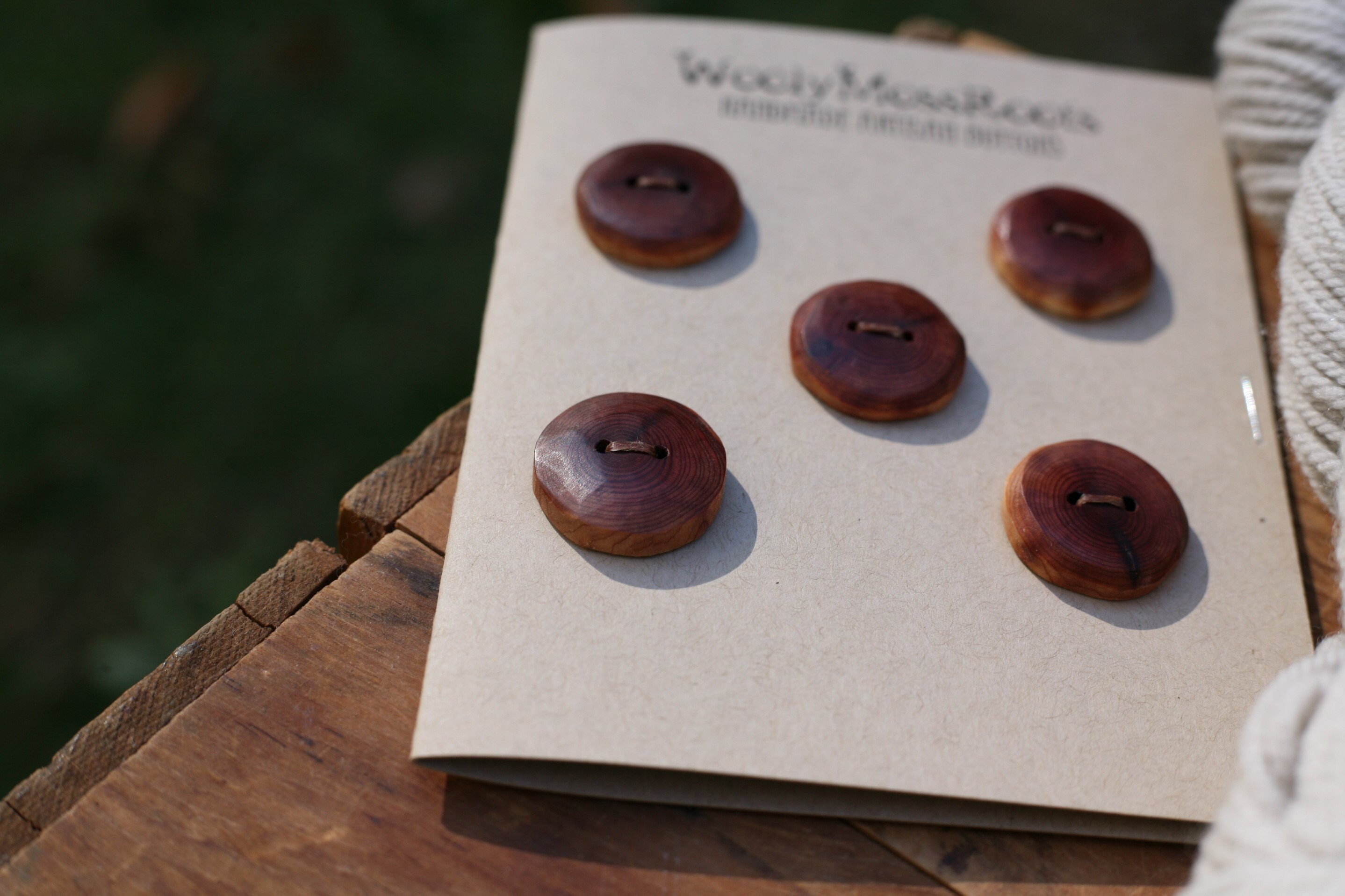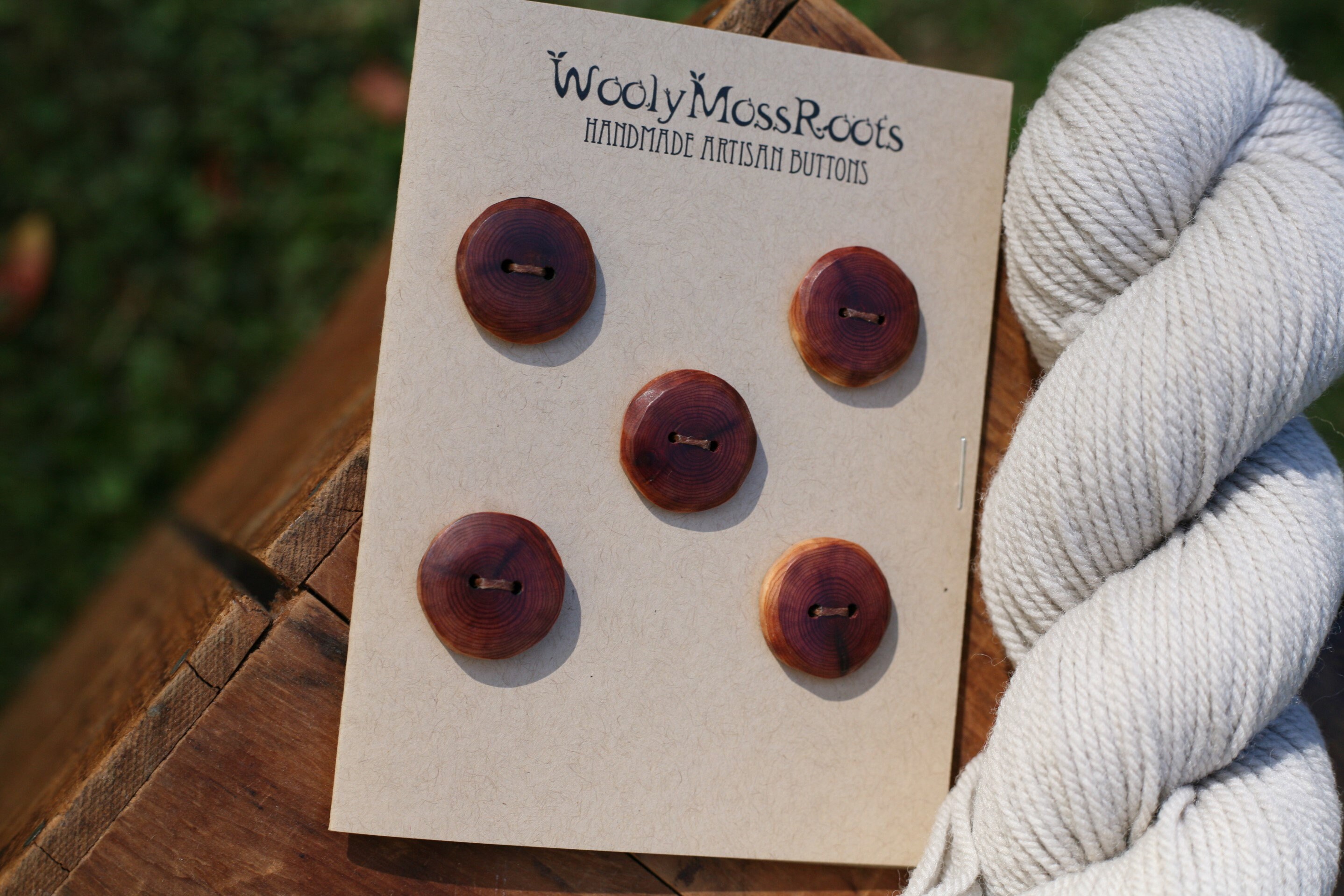 These buttons were created by my husband Jeff in reclaimed western red cedar wood. I love this wood! For one, I am a cedar fan and then you add that gorgeous deep red hue- beautiful! Sanded so smooth, you'll love the way they feel. Pictured with grey yarn, these buttons would pair nicely with many different colors.