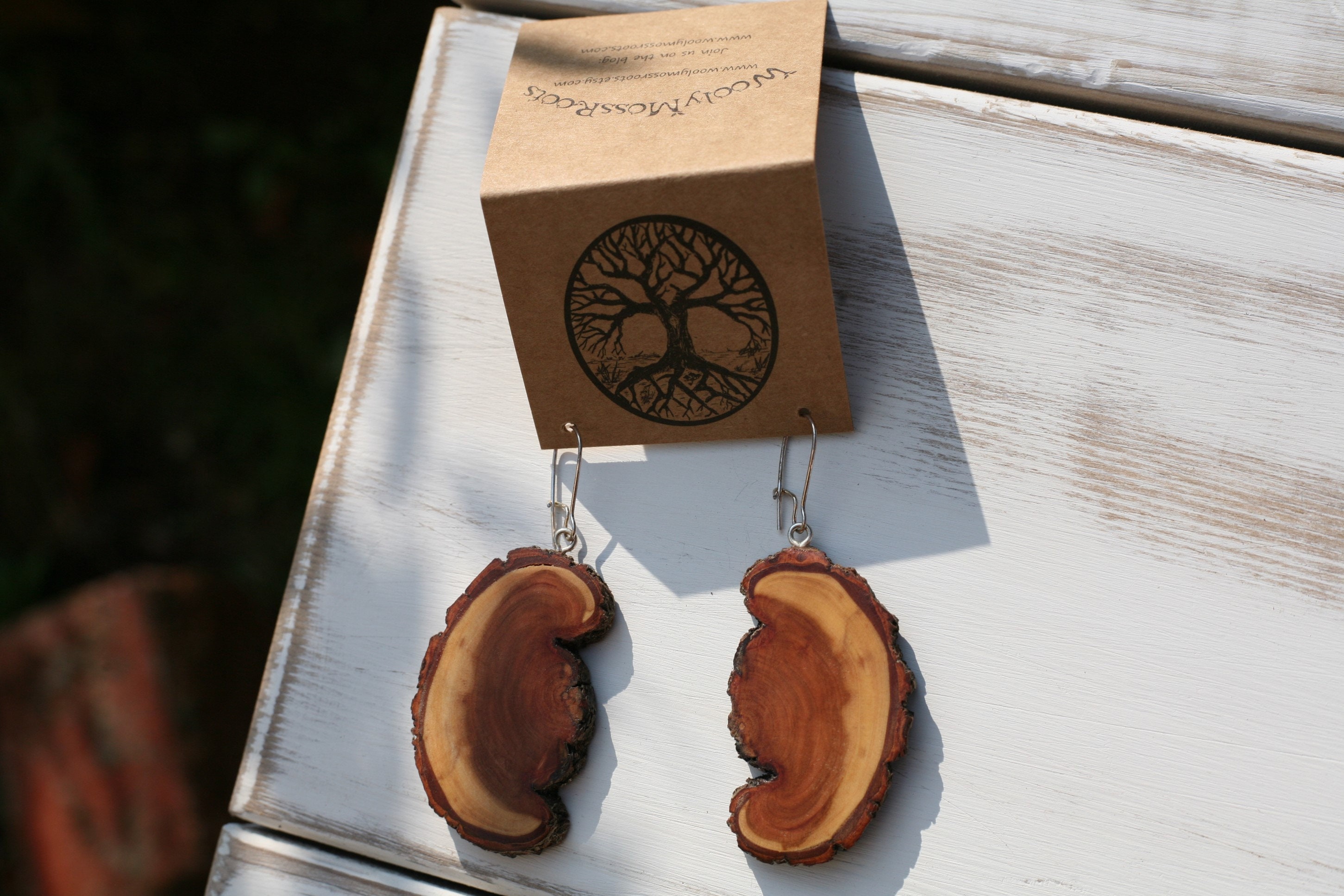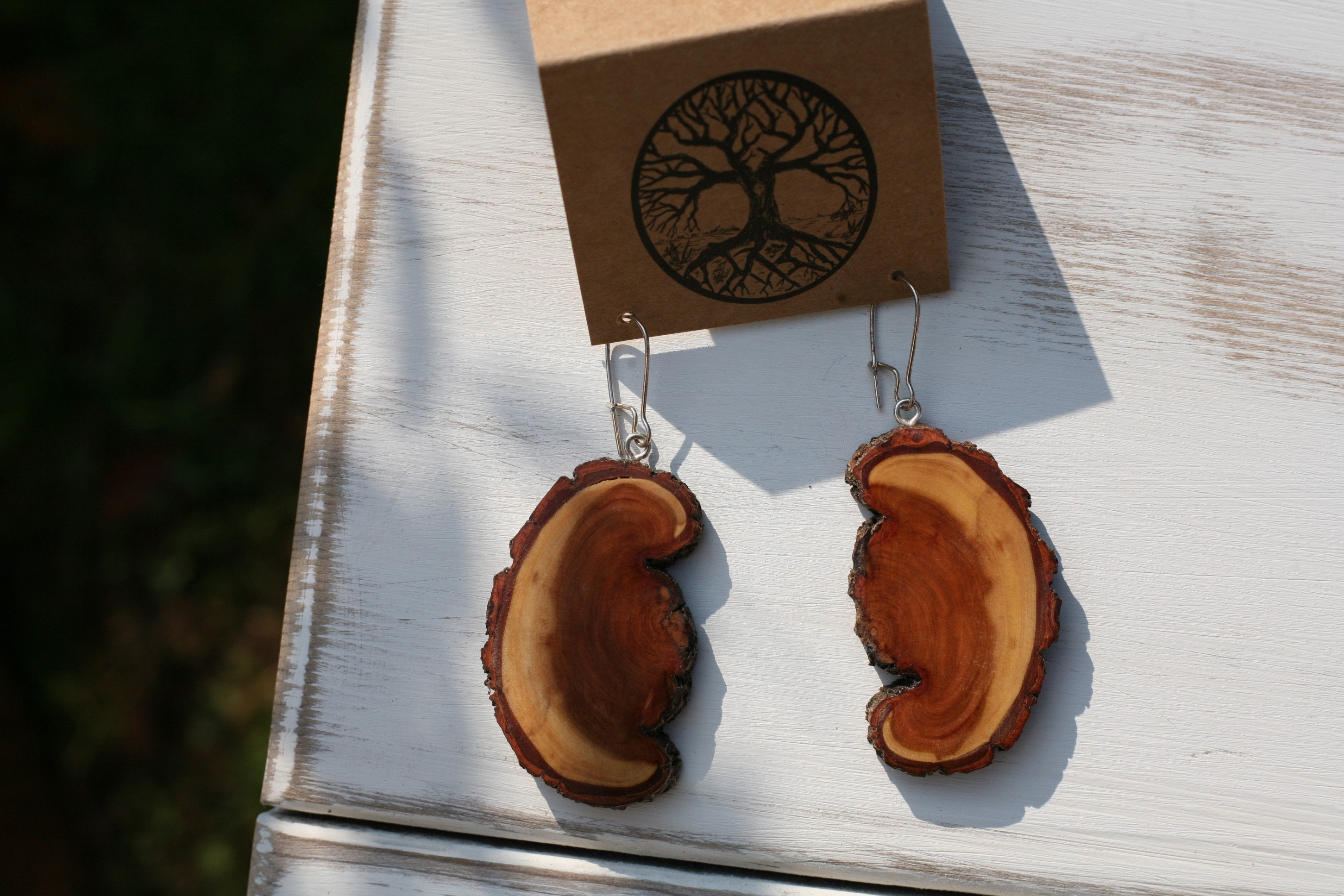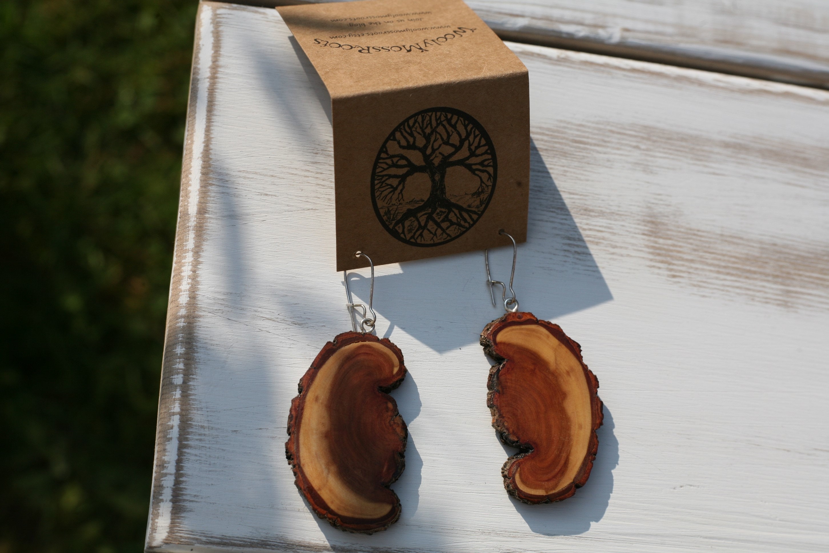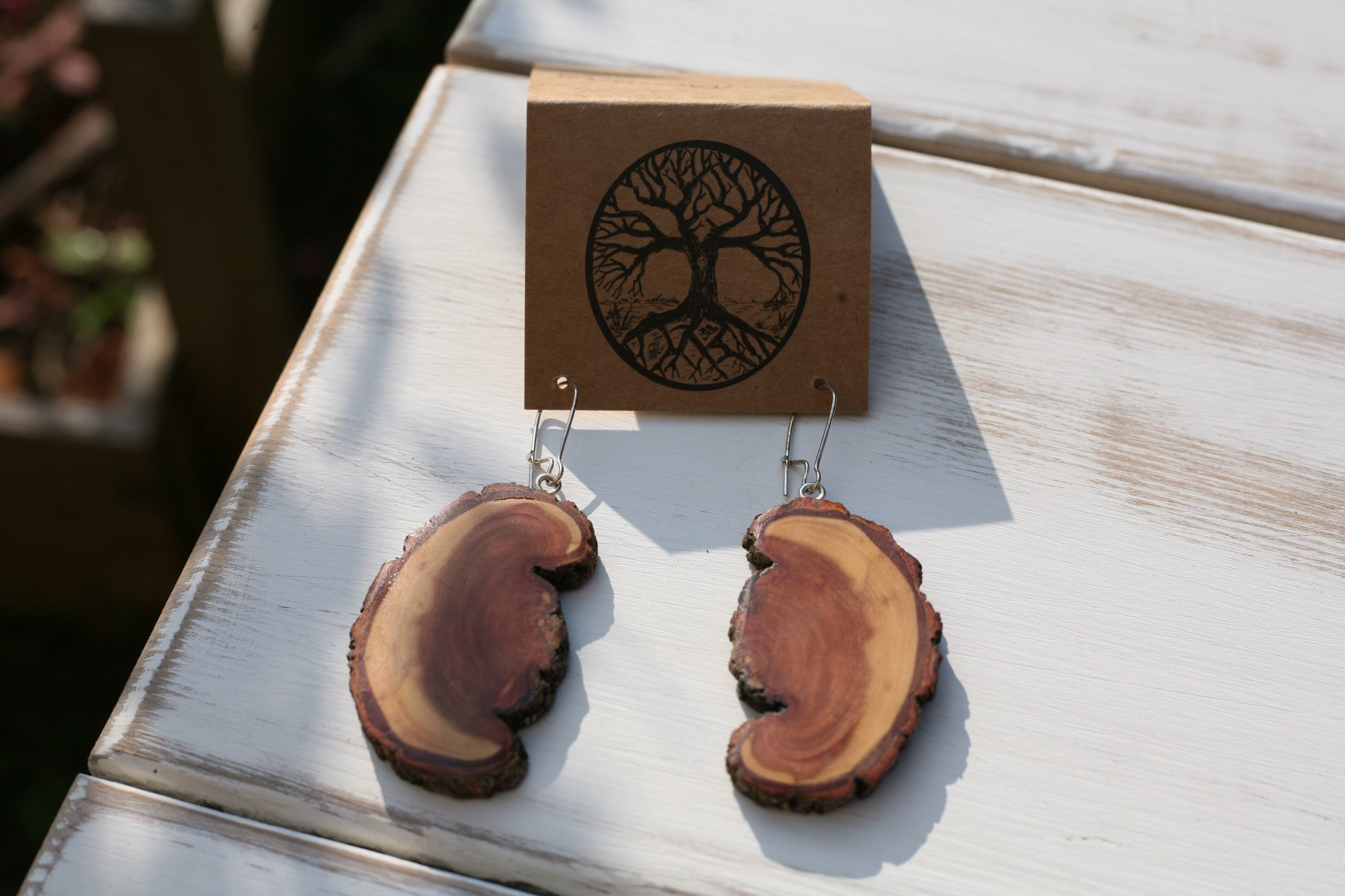 These earrings were created by my husband Jeff in diamond willow wood. Is this wood gorgeous or what? It's a newly discovered favorite of ours and we have a limited supply of it, so it makes this wood even more precious to us. This particular pair of earrings has a really unique shape, and Jeff left the natural shape with how the branch formed. With all the sanding and polishing he does to bring out the beauty of the wood, these earrings are so smooth, you'll love the way they feel. These earrings are more lightweight than you'd think, but if you are looking for the most lightweight earrings that we offer- the cedar earrings are the best choice for that. They come on silver plated ear wires (which can tarnish over time.)