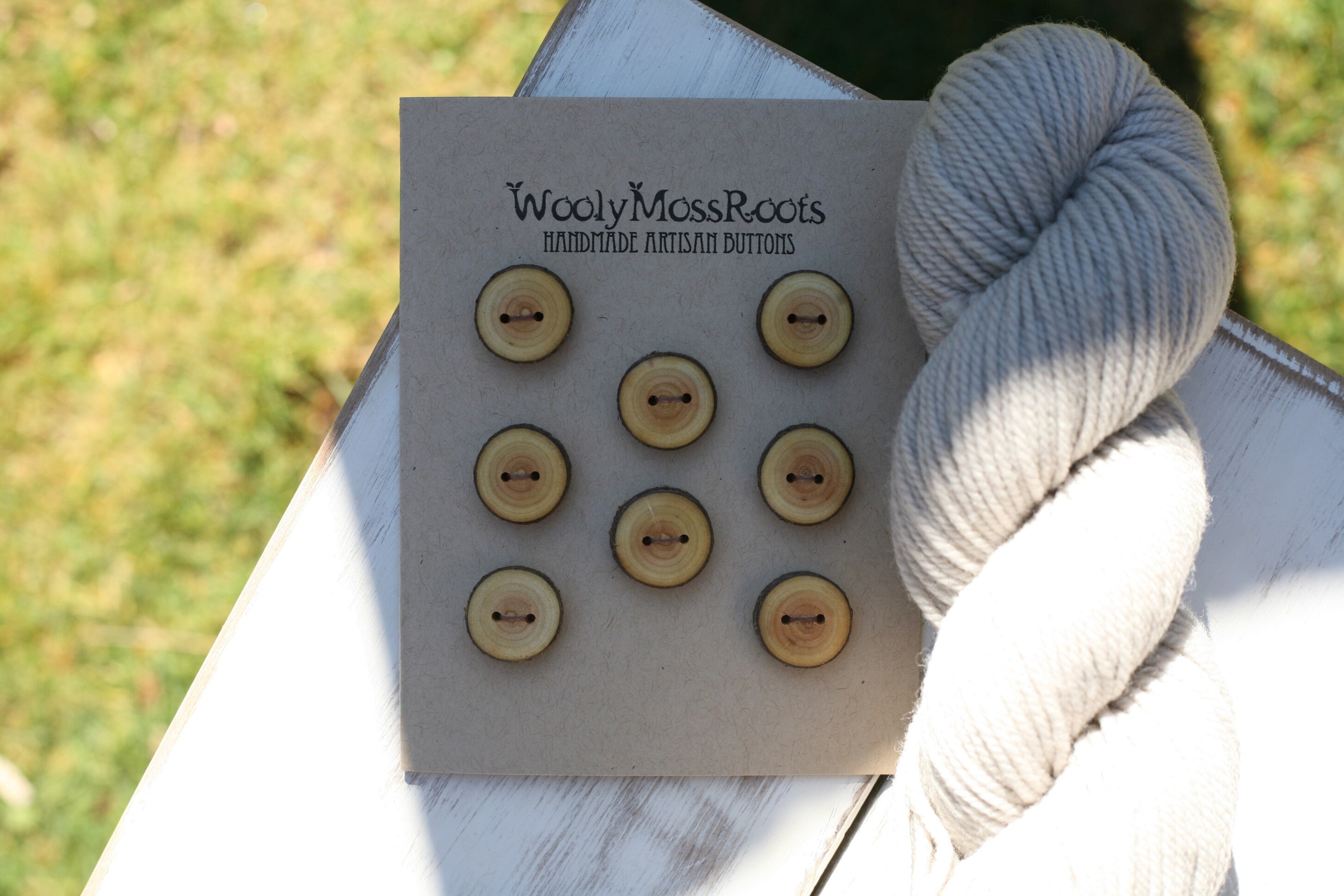 These handmade wooden buttons were created by my husband Jeff in Oregon cascara wood. This wood is naturally this bright, cheery yellow color- I love it! I love the rings of growth and the deeper hue in the center. The natural bark around the edges gives them a woodland look. Sanded smooth, you'll love the way they feel. Pictured with grey yarn, these buttons would go well with many different colors.