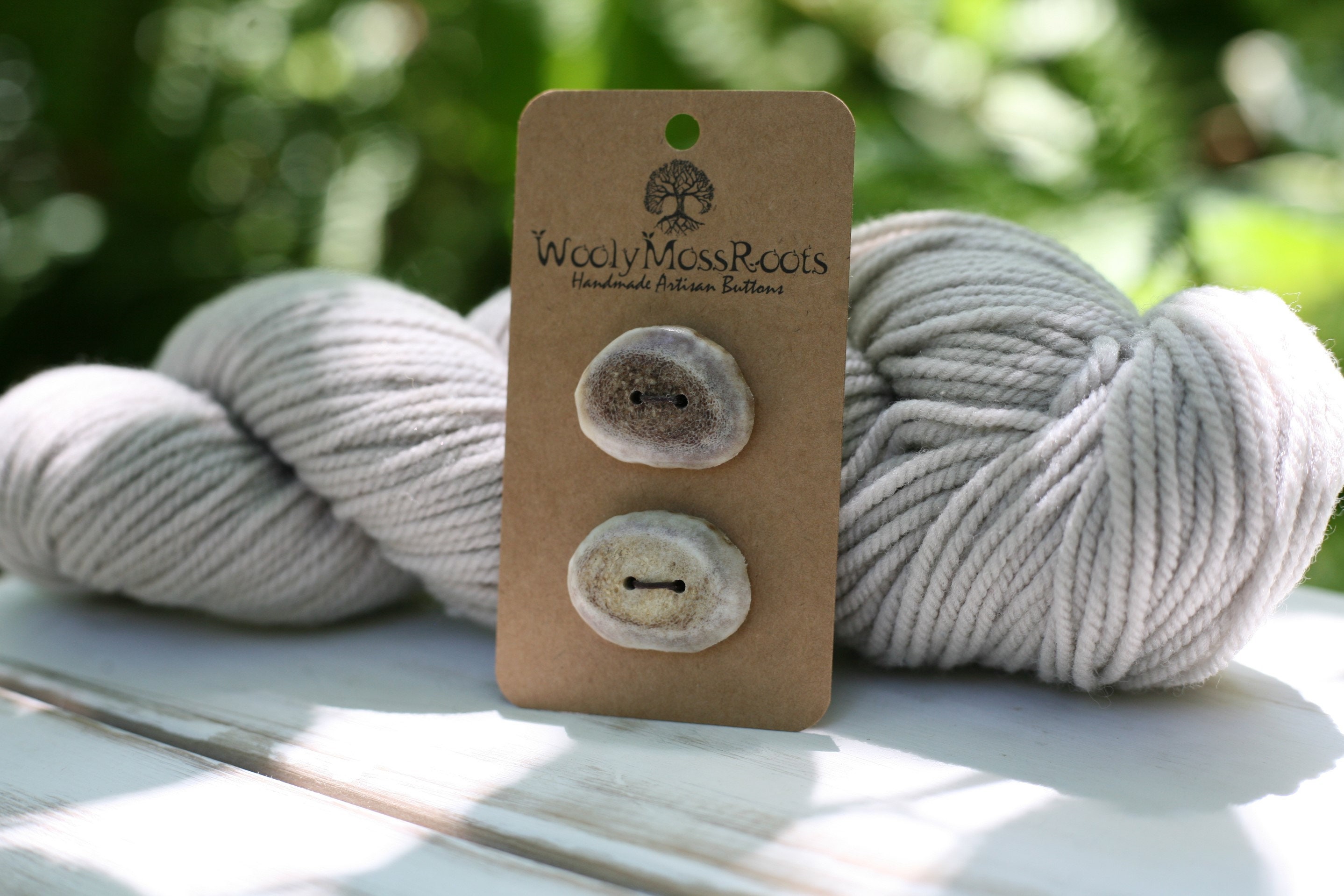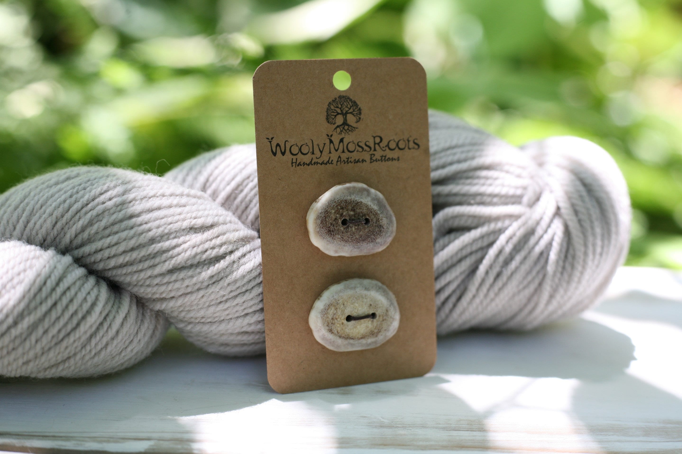 These buttons were created by my husband Jeff in shed deer antler. I just love these antler buttons. The antler buttons hold up so well over time, they are literally heirlooms that you could pass down from generation to generation. (Definitely worth a little more cost.) I love the variety of colors in the antler and the natural edges, I liked these two paired together even though they are different colors. Could be used for separate projects, or for a single project. Sanded so smooth, you'll love the way they feel. Pictured with grey yarn, these buttons would pair nicely with many different colors.