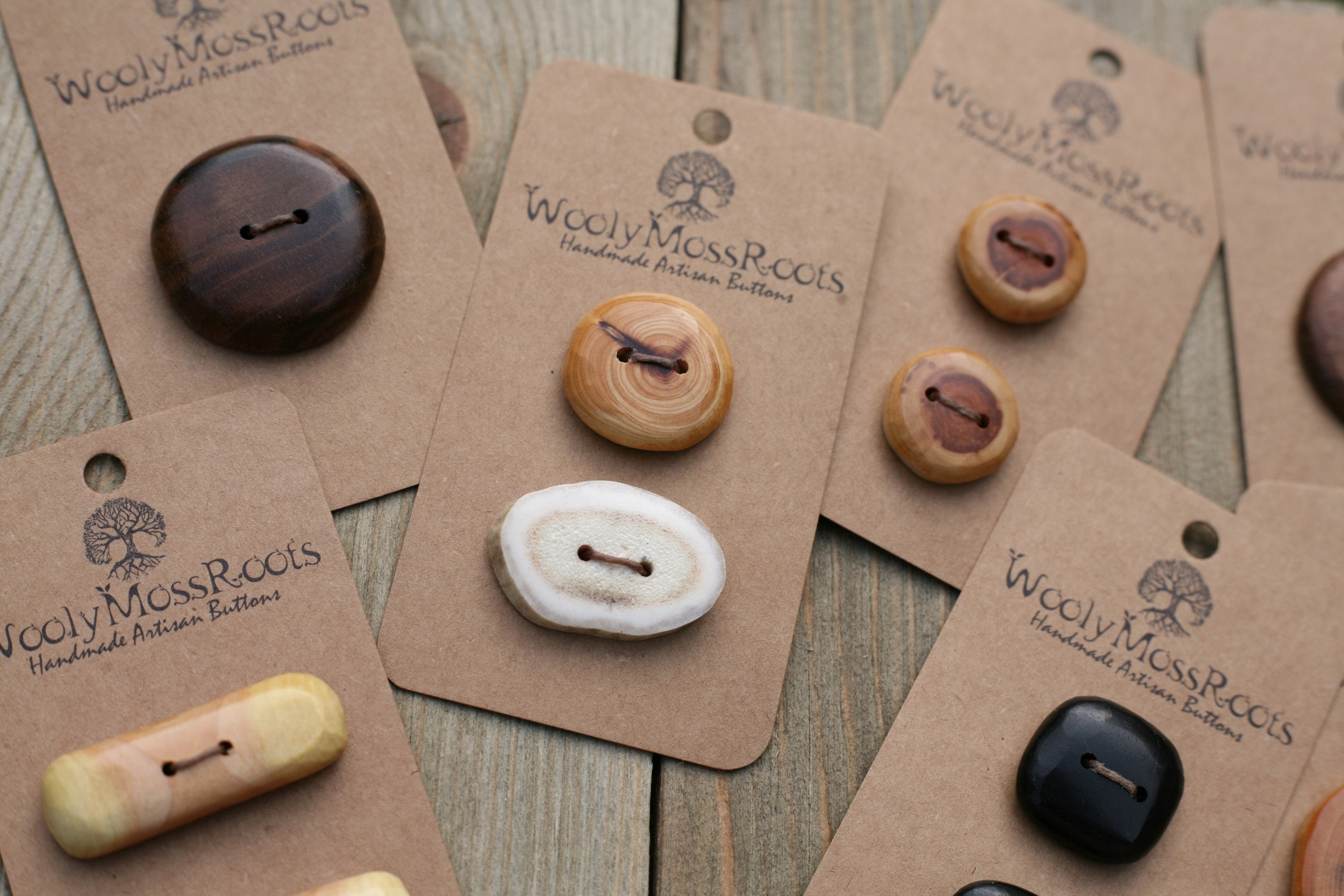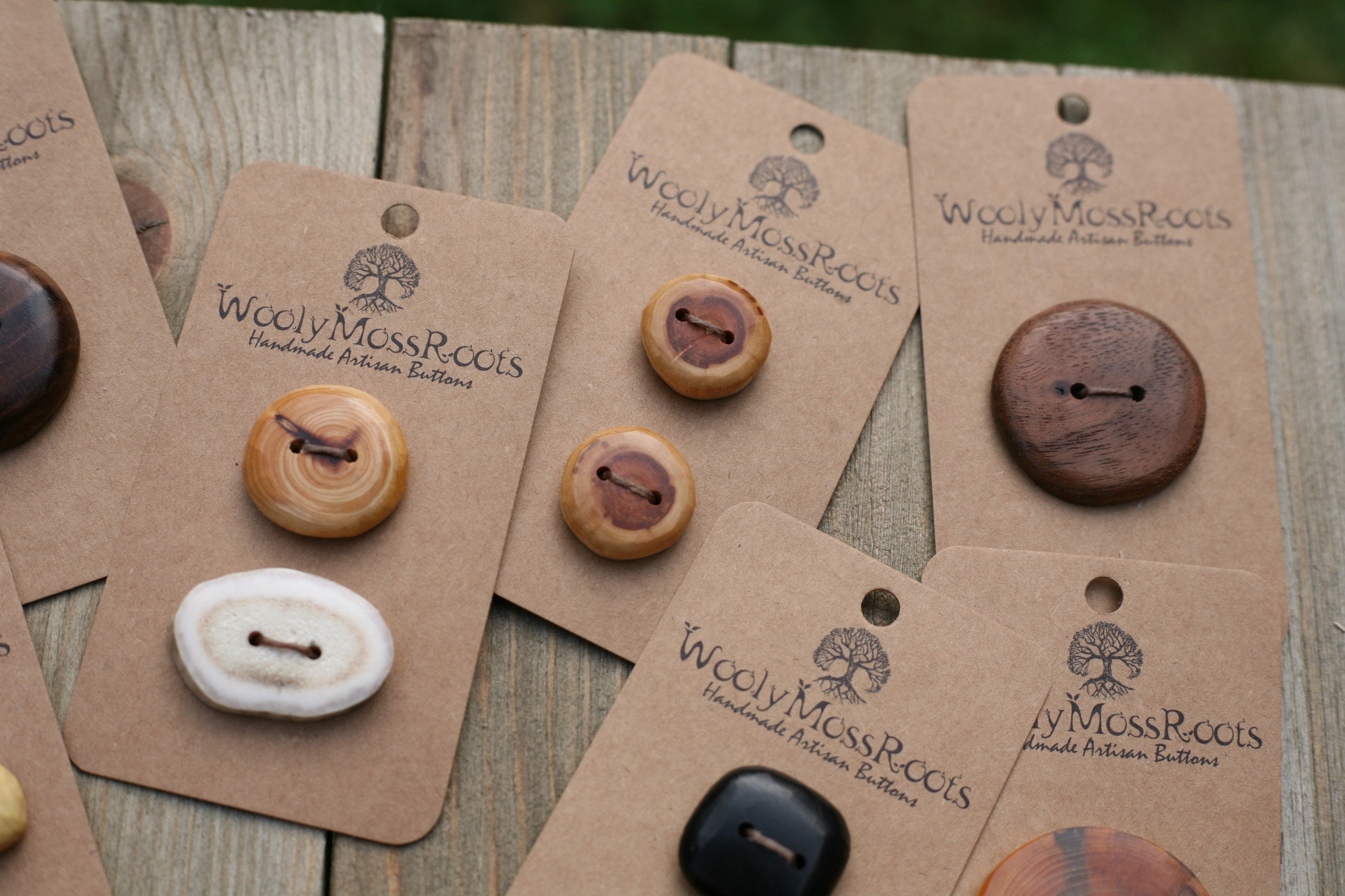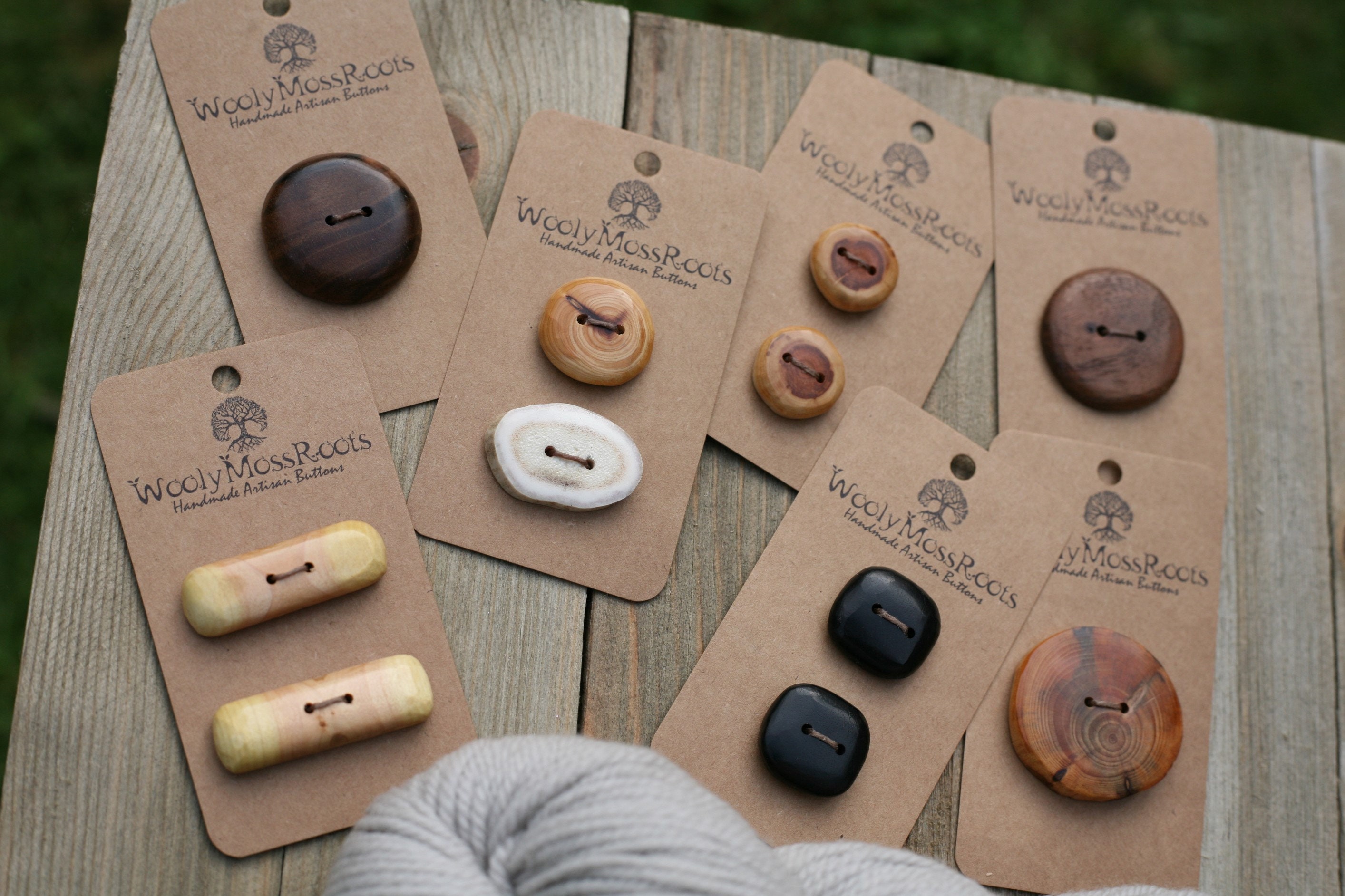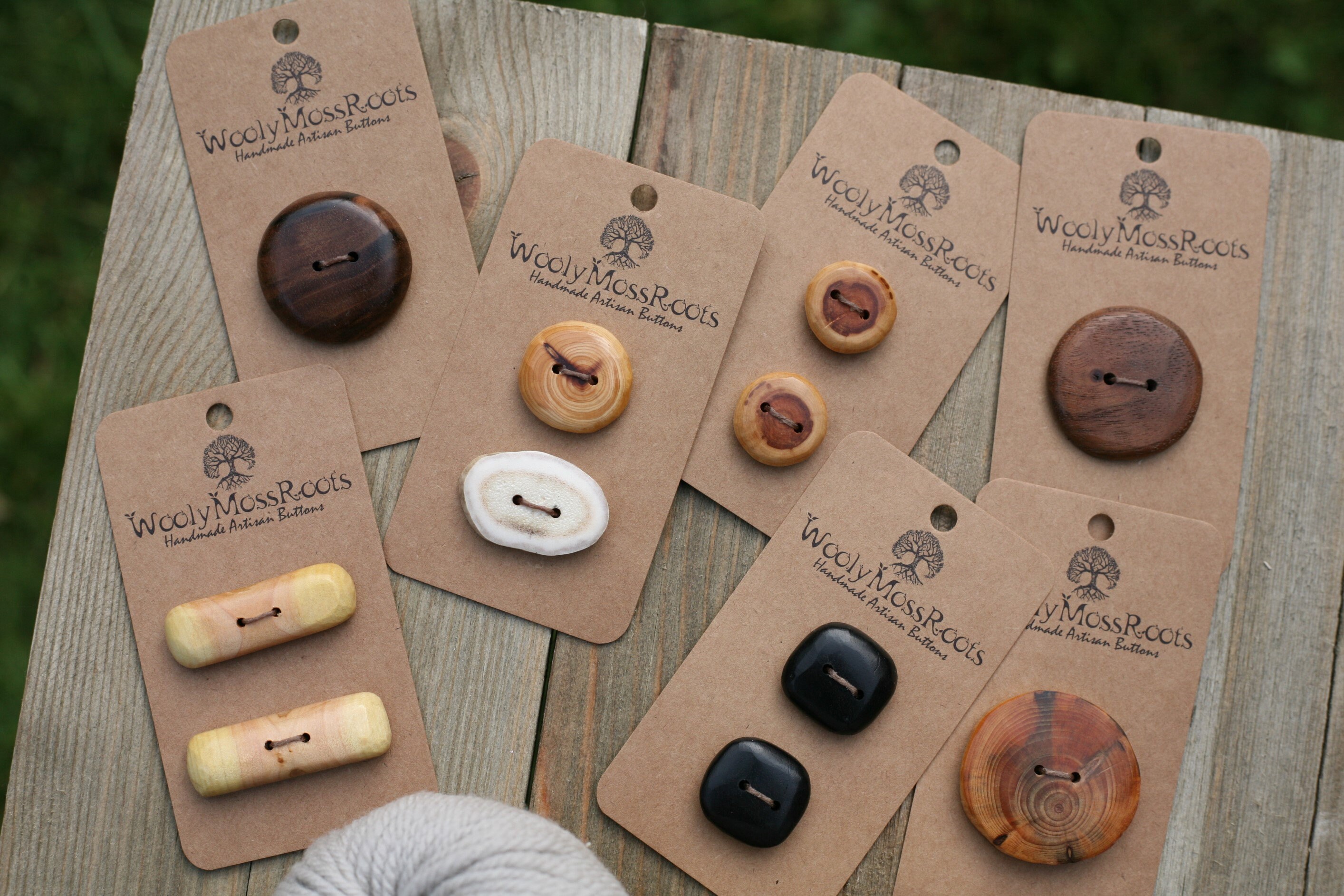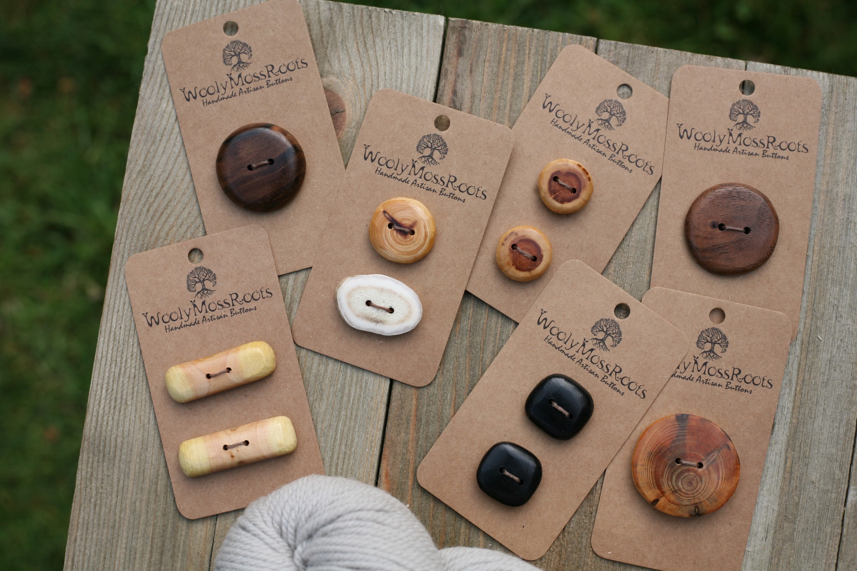 These buttons were created by my husband Jeff in a variety of woods, and one in shed deer antler. There are seven small button cards, with a total of 11 buttons tied to them. This set includes buttons in black walnut wood (two large buttons, on separate cards), Oregon cascara wood (naturally yellow, two toggles), diamond willow wood (two small beauties, with darker hue in centers), hemlock wood from our yard (one large button), reclaimed ebony (two, unique shapes), and red cedar wood & shed deer antler on a card together. (All types of wood labeled on the back of each card so you don't have to worry about remembering them.)