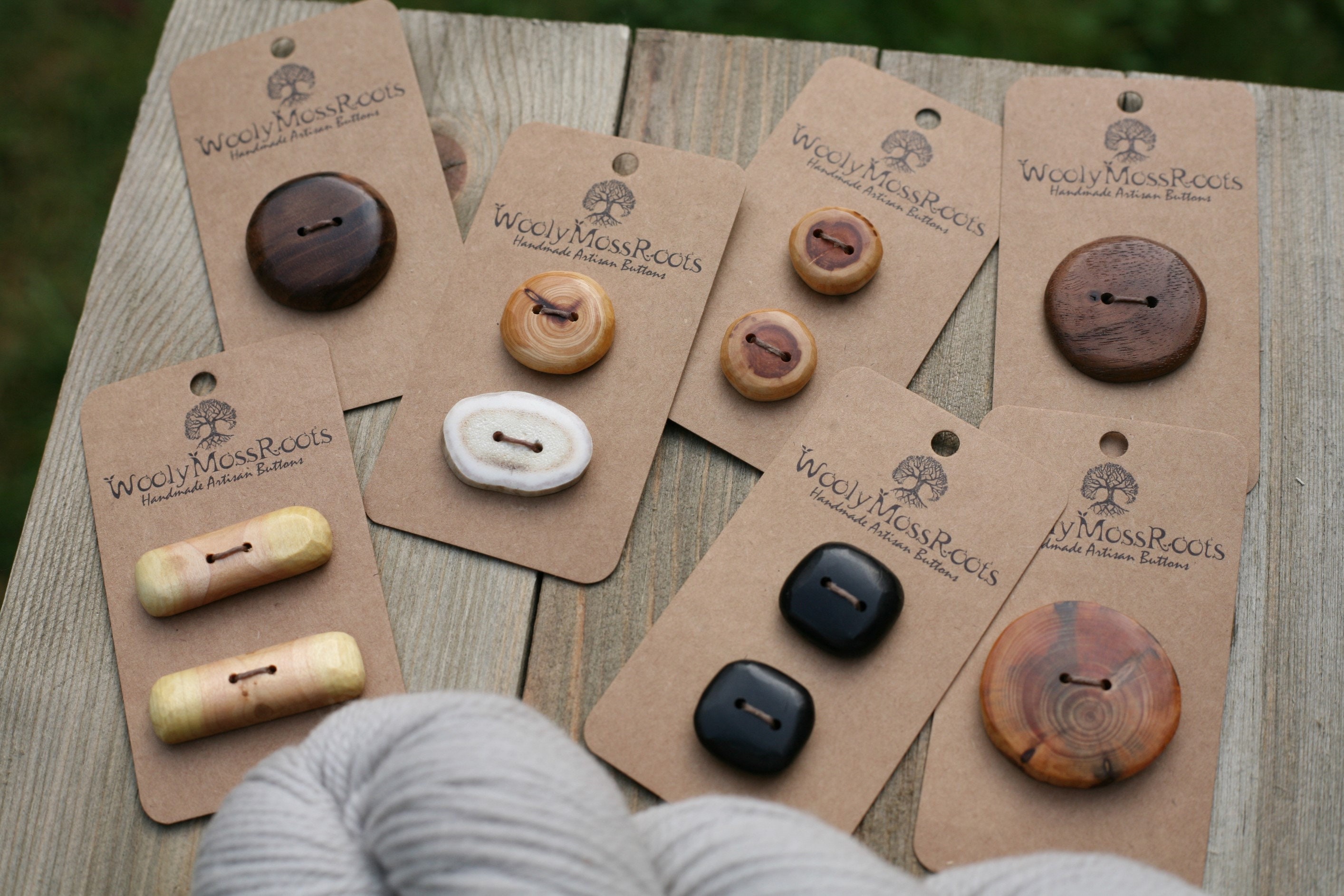 He sands and polishes the buttons so smooth, even around the edges, you'll love the way they feel. All the sanding and polishing also brings out the beauty of the grain, and makes the wood glow. Pictured with grey yarn, these buttons would pair nicely with many different colors.