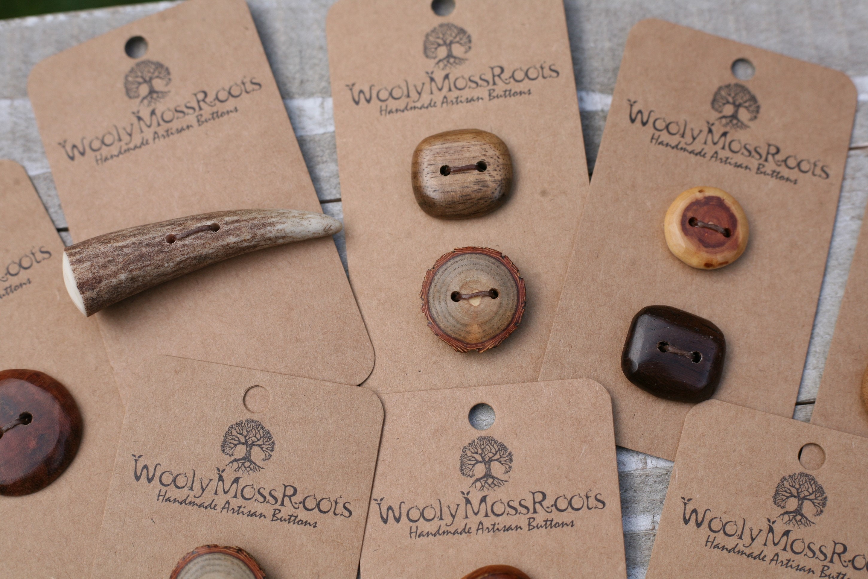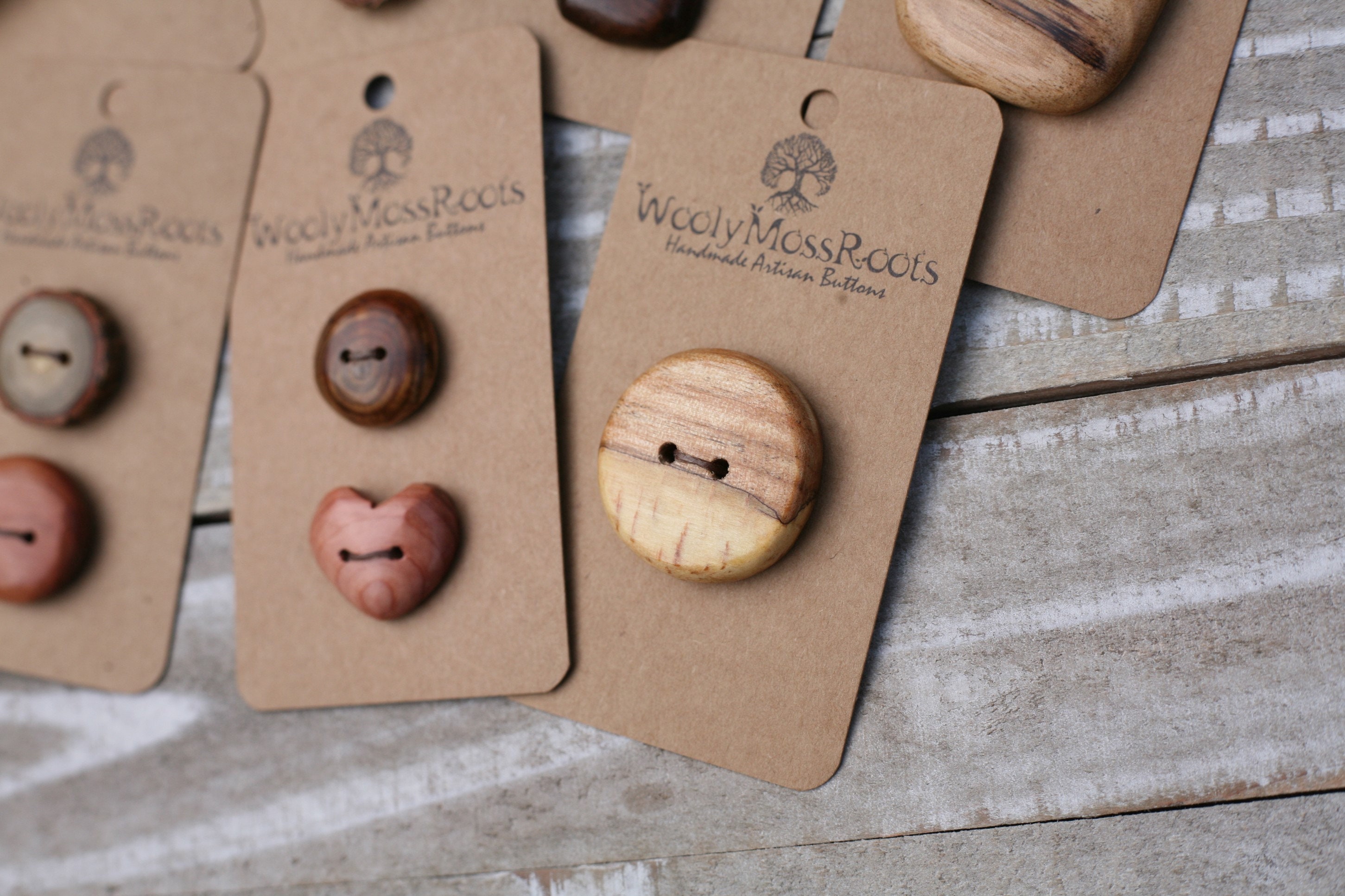 These buttons were created by my husband Jeff in a variety of woods. This listing includes eight small button cards, with a total of 12 buttons tied to them. (All pictured.) This set includes