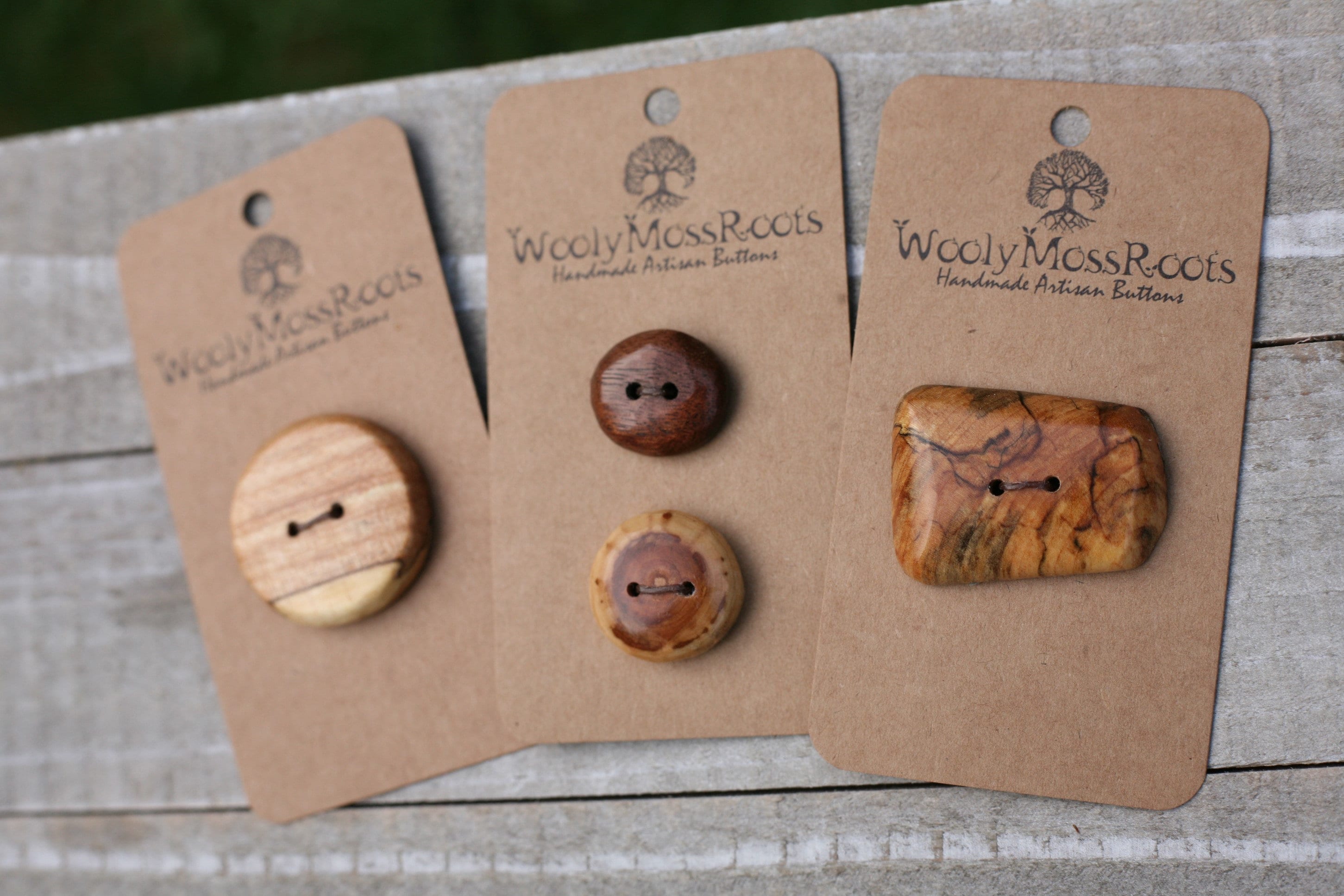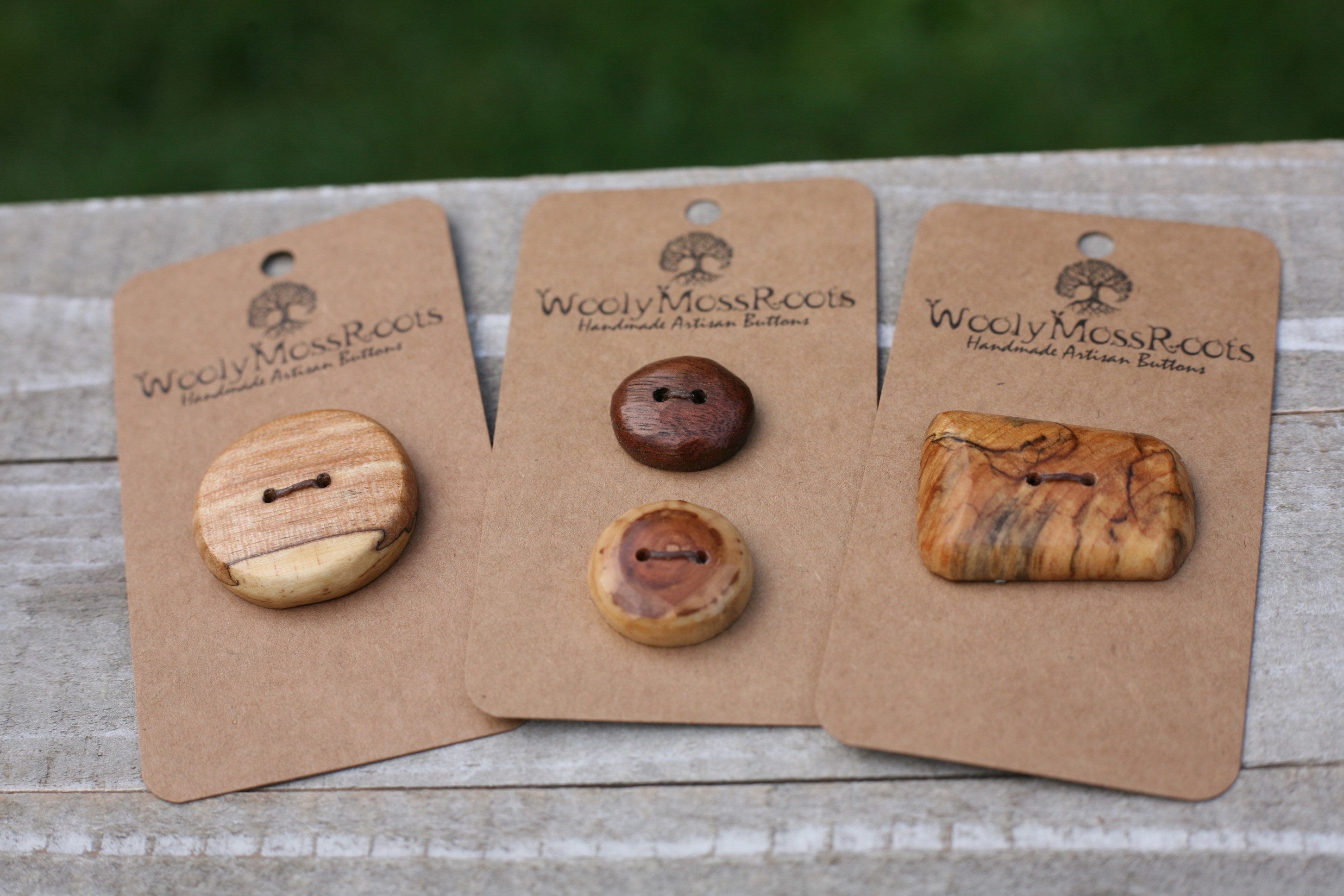 These buttons were created by my husband Jeff in a variety of woods. This listing includes three small button cards, with a total of 4 buttons tied to them. (All pictured.) This set includes two buttons in spalted maple (same wood- yet both so different and unique), one button in black walnut wood, and one button in diamond willow wood. (All types of wood labeled on the back of each card so you don't have to worry about remembering them.)